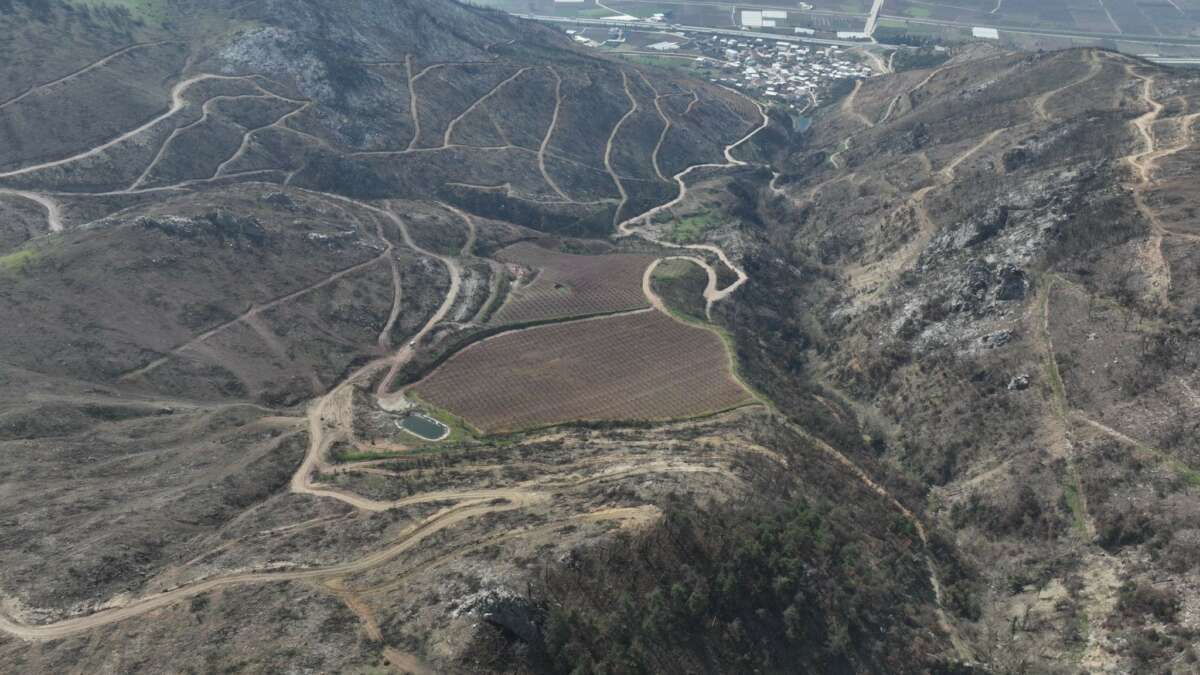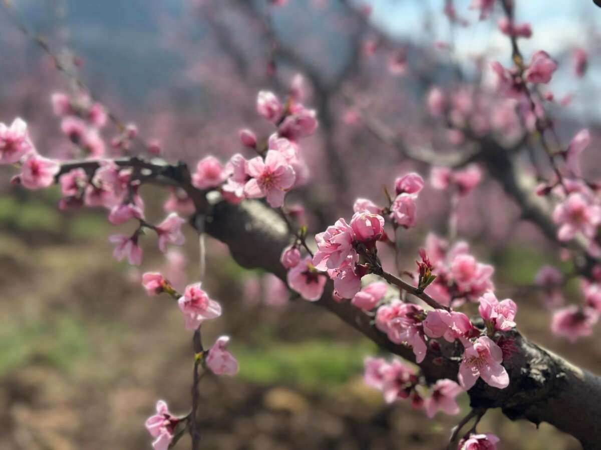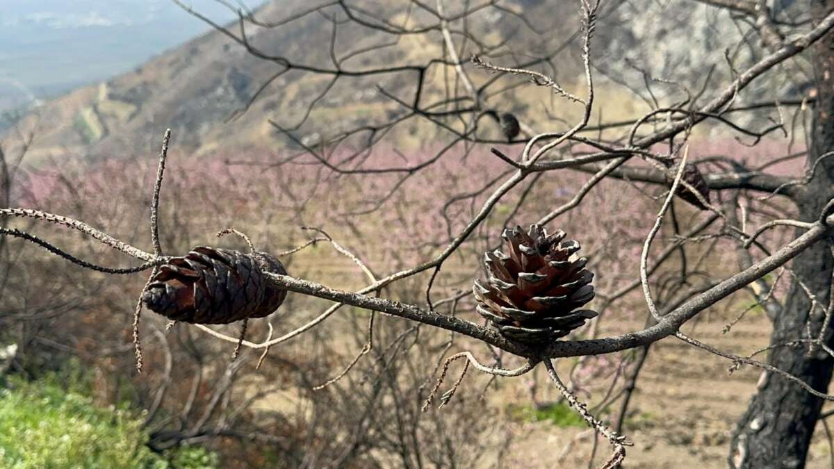 Yükseltilerin arasında, binlerce dekar griye çalan alanın ortasında göz kamaştırıcı bir manzara, bir umut isyanı yükseliyor. Yangının pençesinden sahiplerinin bakımları sayesinden kurtulan, dağların kuytusunda saklı 50 dönümlük şeftali bahçeleri, baharın gelişiyle pembe çiçeklere durdu ve büyüleyici bir görsel şölen sundu.