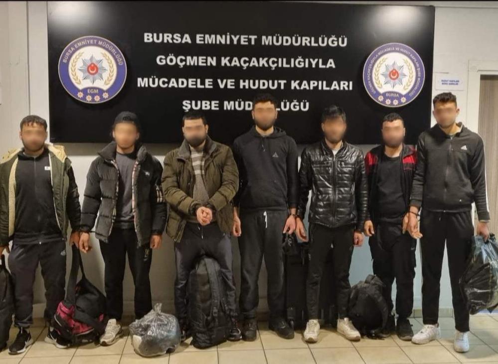 Yapılan kontrollerde yakalanan kişilerden 6’sının herhangi bir kimlik belgesinin bulunmadığı ve Türkiye’ye yasa dışı yollarla giriş yaptıkları belirlendi. Bir kişinin ise Bursa’ya kayıtlı Geçici Koruma Kimlik Belgesi taşıdığı tespit edildi.