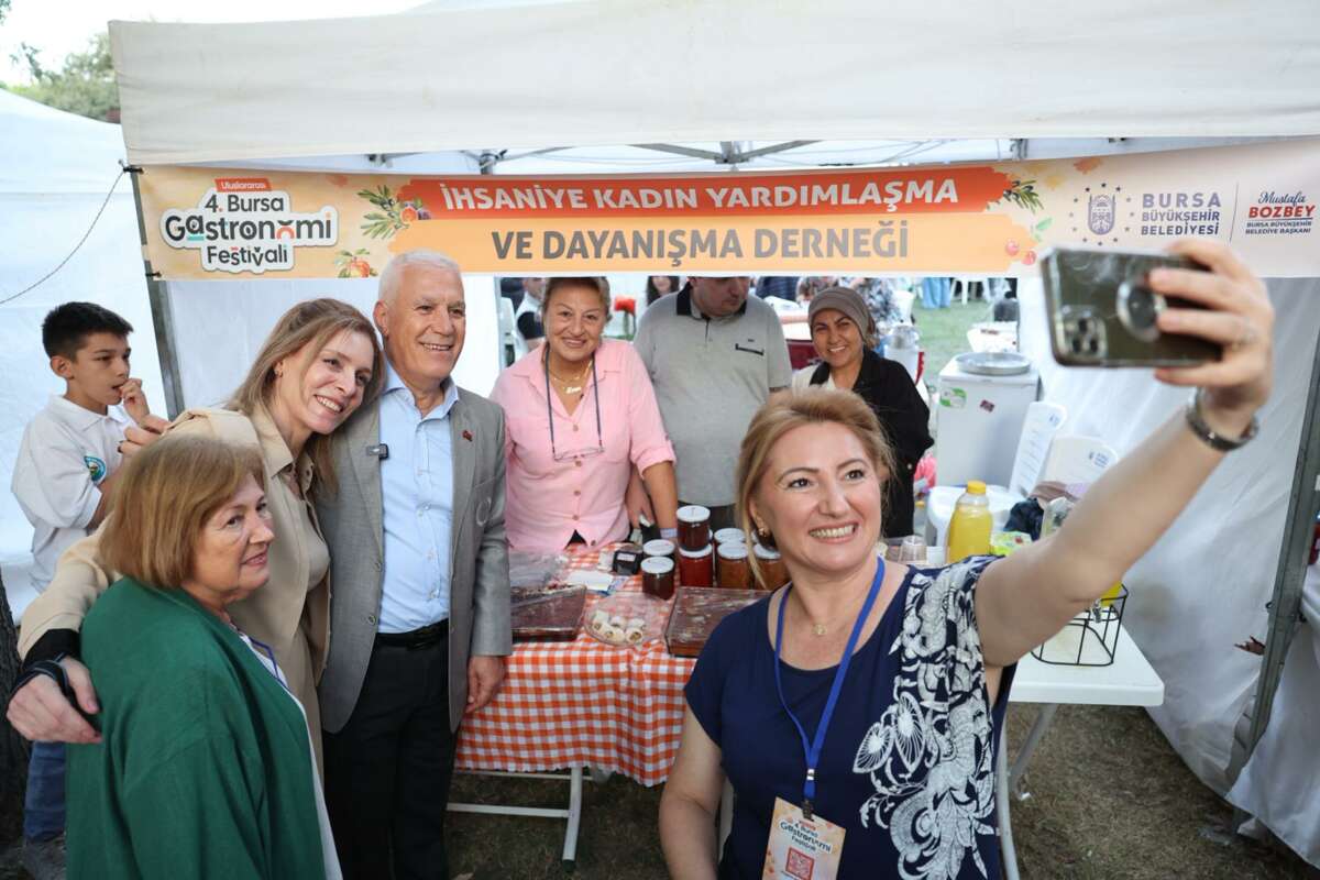 Bursa Büyükşehir Belediye Başkanı Mustafa Bozbey ve eşi Seden Bozbey, festivalin üçüncü gününde de alanı gezerek gastronomi tutkunlarıyla sohbet etti. Üreten Kadınlar Sokağı’nı da ziyaret eden Başkan Bozbey, kadın kooperatiflerinin üyelerinden çalışmaları hakkında bilgi aldı. Kadın kooperatiflerine teşekkür eden Başkan Bozbey, “Kadın kooperatiflerimizin Bursa gastronomisinin geliştirilmesinden büyük emeği ve katkısı var. Unutulmaya yüz tutmuş olan yemeklerin günümüze getirilmesinde ve farklı yorumla sunulmasında inanılmaz katkı sağladılar. Kadın dernek ve kooperatiflerimiz, şeflerimiz ve sivil toplum kuruluşlarımızla birlikte daha güzel, daha iyi gastronomi festivali yapacağız. Onların ürettiği değerlerle birlikte Bursa gastronomisinin daha yukarıya çıkmasını sağlayacağız” diye konuştu.