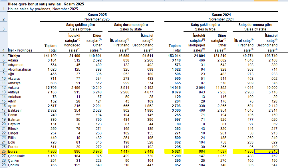 Türkiye İstatistik Kurumu (TÜİK), Kasım 2025 dönemine ilişkin konut satış verilerini açıkladı. Verilere göre Bursa’da Kasım ayında toplam 4 bin 866 konut satışı gerçekleşti. Bu satışların 896’sı ipotekli, 3 bin 970’i ise diğer satışlar kapsamında yapıldı.