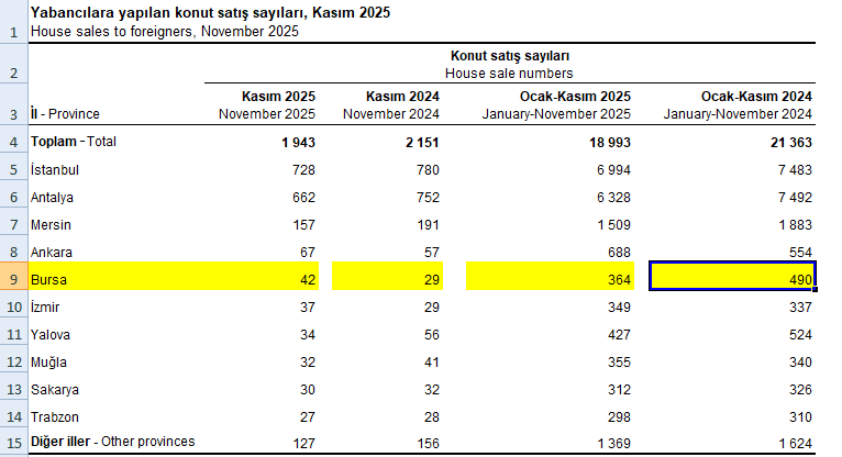 Ocak–Kasım dönemini kapsayan 11 aylık verilere göre ise Bursa’da yabancılara satılan konut sayısı 364 oldu. 2024’ün aynı döneminde bu sayı 337 olarak kayıtlara geçmişti.