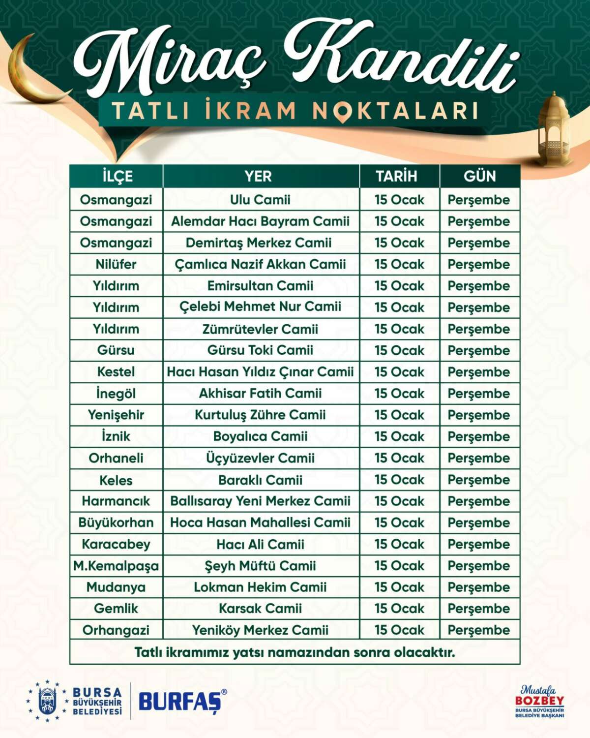 Paylaşılan bilgilere göre, 15 Ocak Perşembe günü yatsı namazının ardından, Osmangazi’den Nilüfer’e, Yıldırım’dan İnegöl’e kadar Bursa’nın farklı ilçelerinde belirlenen 21 cami noktasında vatandaşlara tatlı dağıtımı yapılacak.