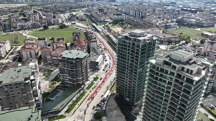Bursa’da binlerce öğrencinin 500 metrelik dev Türk Bayrağı ile oluşturduğu Cumhuriyet korteji, herkes tarafından büyük ilgi gördü. 5 metro treni uzunluğundaki bayrak ile BURSARAY’ın yan yana geldiği anlar gökyüzünden drone ile görüntülendi. İki farklı bulvarı birleştiren bir cadde boyunca uzanan bayrağı yüzlerce öğrenci ellerinde taşıdı.