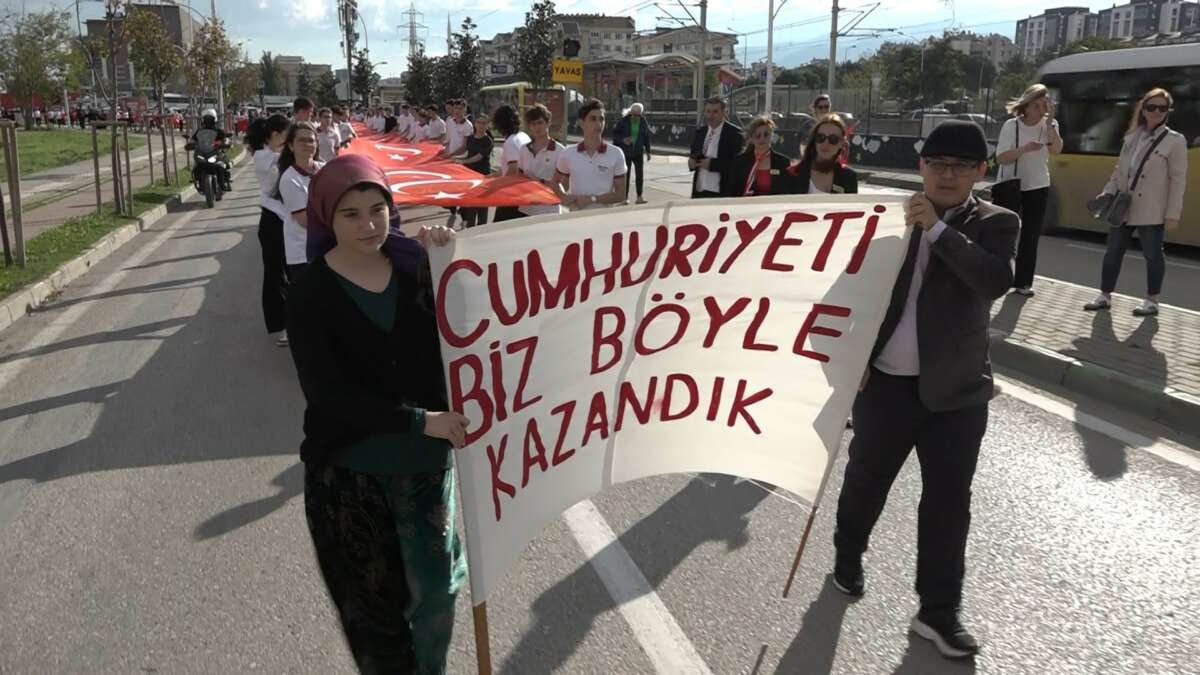 Cumhuriyet Bayramı kutlamaları çerçevesinde Bursa‘nın Nilüfer ilçesinde organize edilen bayrak yürüyüşü, ilkokul, ortaokul ve lise öğrencilerinin katılımıyla coşkulu bir şekilde gerçekleşti. 500 metre uzunluğunda bayrak öğrenciler tarafından bir caddeyi boydan boya geçecek şekilde açıldı. Okuldan kortej eşliğinde çıkan öğrenciler Ahmet Taner Kışlalı ve Özlüce Bulvarını ellerinde taşıdıkları 500 metrelik bayrak ile birleştirdi. Yaklaşık 5 metro treni uzunluğundaki Türk bayrağı BURSARAY istasyonu önünden geçerken hareket halindeki tren ile yan yana gelince o anlarda drone ile havadan görüntülendi. Büyük gökdelenlerin arasından görüntülenen 500 metrelik Türk bayrağı renkli görüntülerin oluşmasına sebep oldu.