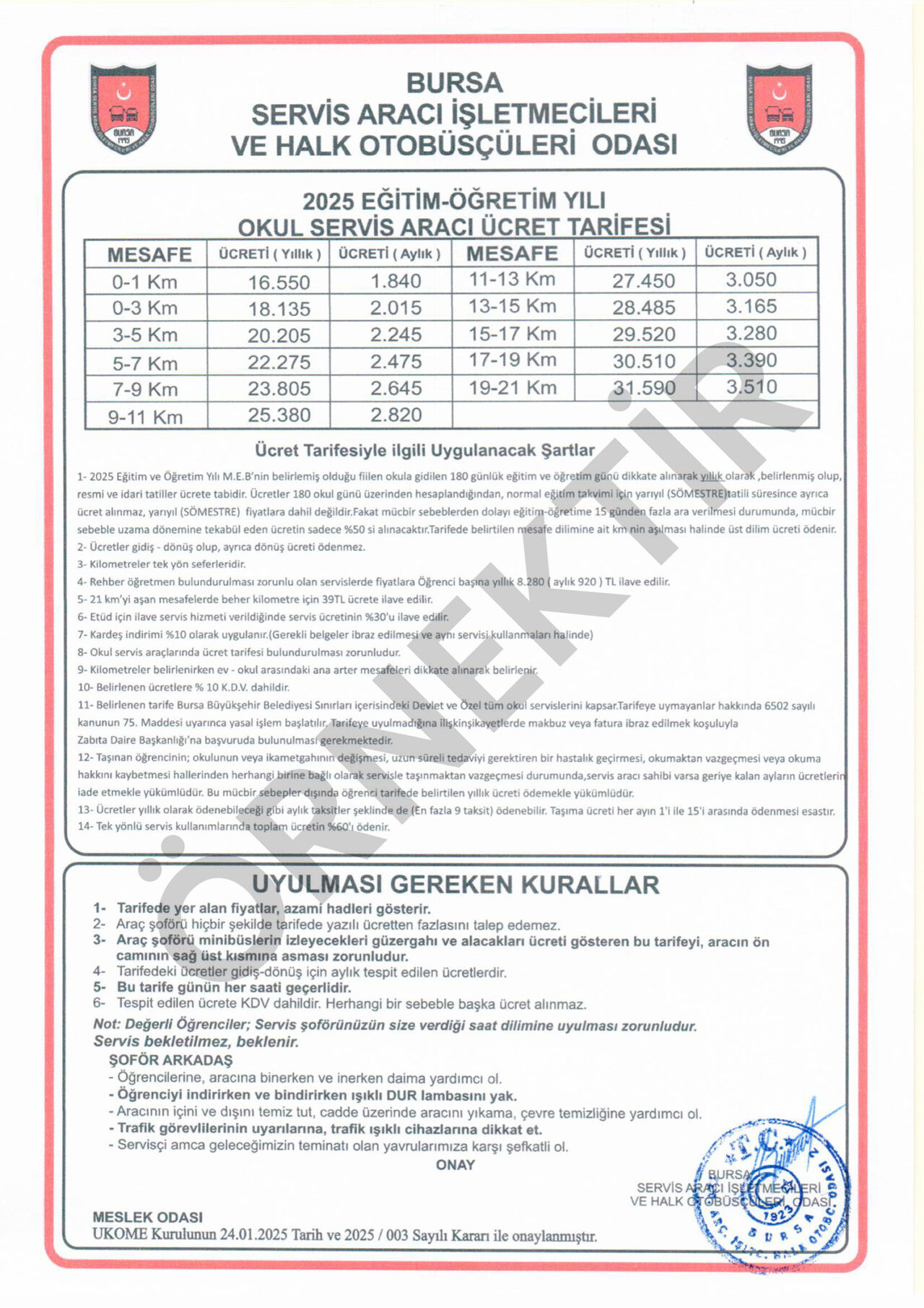 Bursa Servis Aracı İşletmecileri ve Halk Otobüsçüleri Odası tarafından açıklanan yeni tarifeler şöyle: