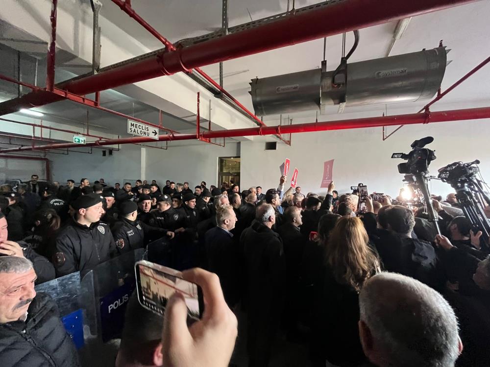 Saat 11.00’de yapılacak başkanvekilliği seçimi öncesi belediye binası çevresinde olağanüstü güvenlik tedbirleri alındı. Çevik kuvvet bariyer kurdu, tomalar hazır bekledi.