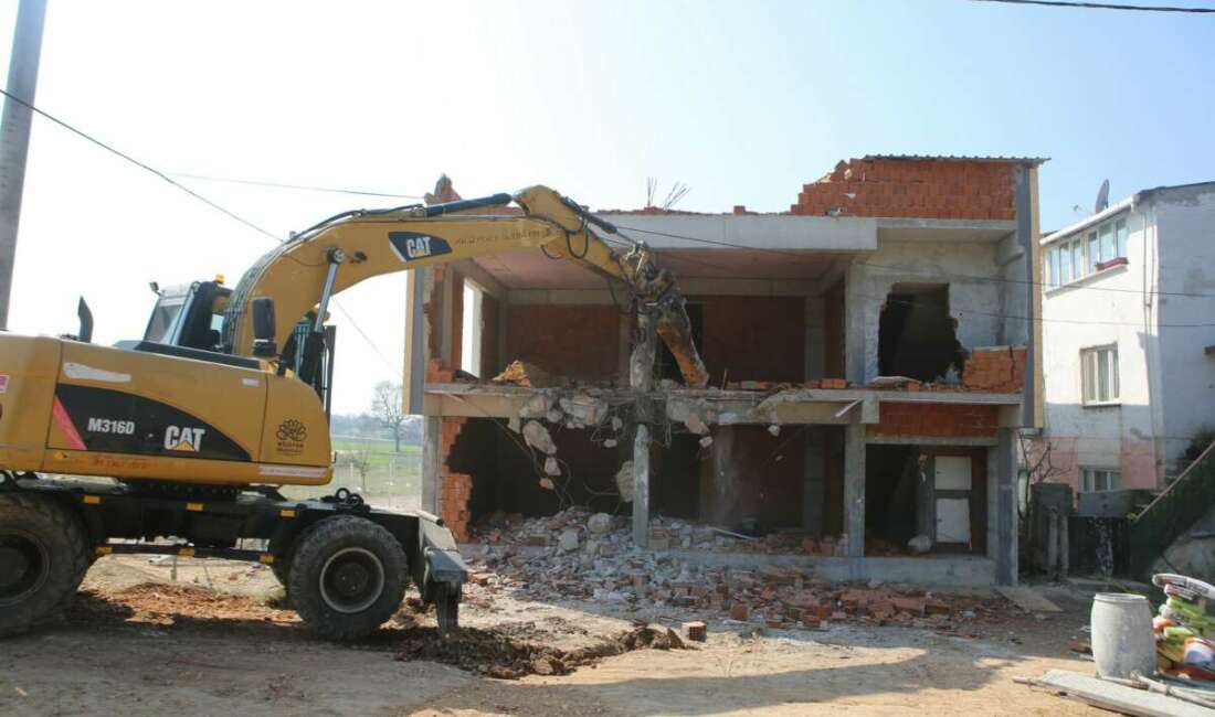 İki katlı kaçak bina yıkım ekiplerinin müdahalesiyle yerle bir oldu.