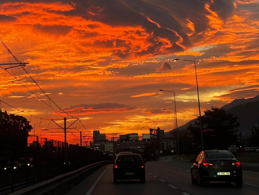 Bursa'da sabah saatlerinde gökyüzünde beliren sıra dışı bulut oluşumu şehrin farklı noktalarından görüntülendi. Gün doğumuyla birlikte turuncu ve kırmızı tonlarına bürünen gökyüzü, adeta kartpostallık manzaralar ortaya çıkardı.