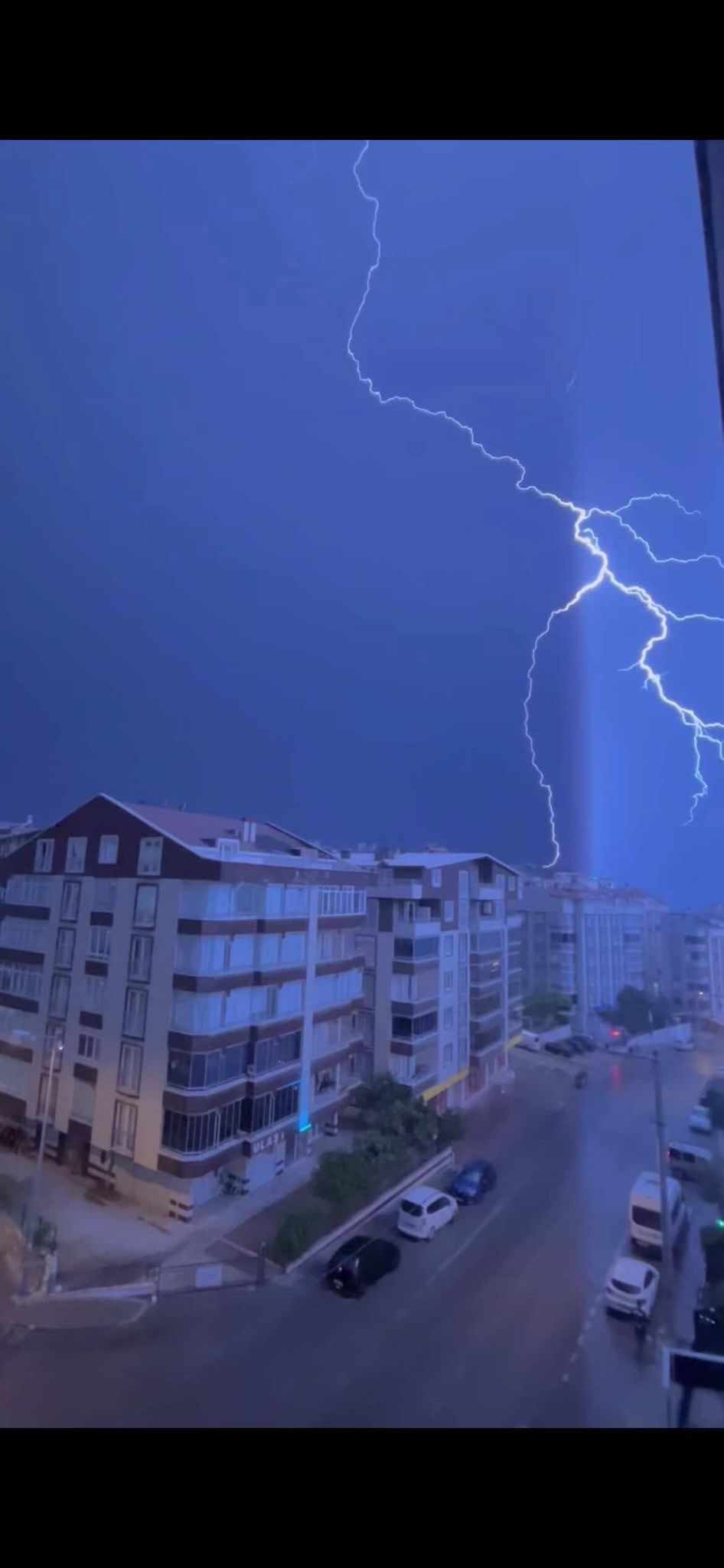 Bursa’da akşam saatlerinde atıştıran yağmur damlaları gecenin karanlığı ile birlikte yerini gök gürültüsüne bıraktı. Gökyüzünden neredeyse yere kadar uzanan şimşek gecenin karanlığını aydınlığa çevirdi