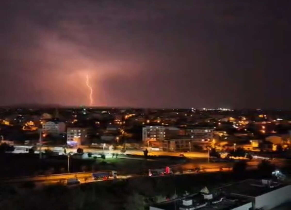 Bursa'nın Karacabey ilçesinde akşam saatlerinde art arda çakan şimşekler geceyi adeta gündüze çevirdi.