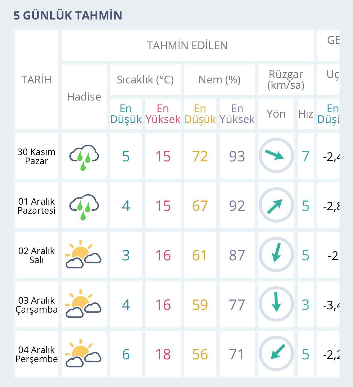 2 Aralık Salı günü itibarıyla yağışın kenti terk etmesi bekleniyor. Salı günü parçalı bulutlu bir hava hâkim olurken sıcaklıklar gece 3, gündüz 16 derece olarak tahmin ediliyor. 3 ve 4 Aralık tarihlerinde ise zaman zaman güneş görülecek, sıcaklık Perşembe günü 18 dereceye kadar yükselecek.