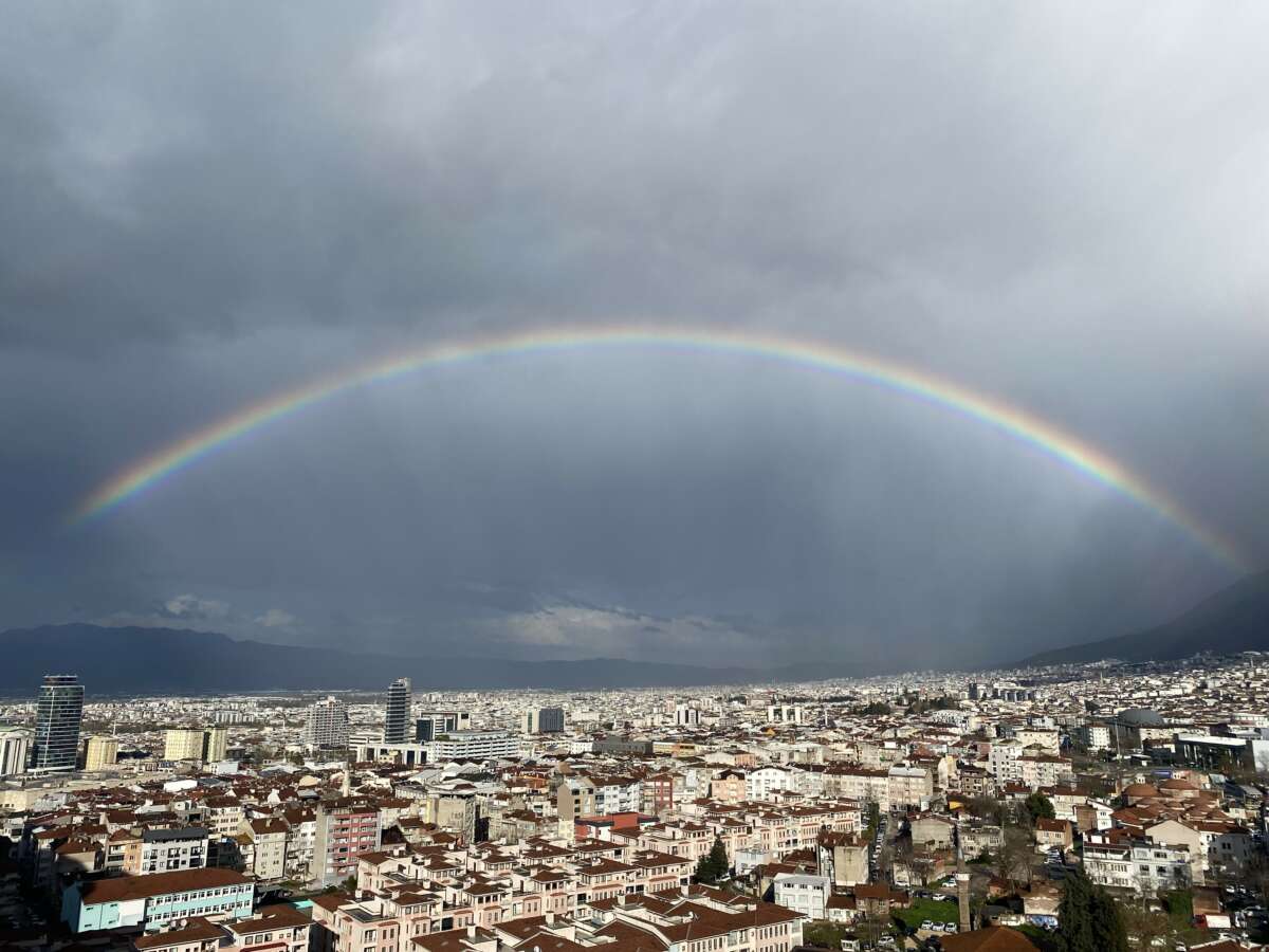 Öğleden sonra etkisini gösteren yağmur bulutlarının dağılmaya başlamasıyla birlikte gökyüzünde beliren gökkuşağı, vatandaşların ilgisini çekti. Şehrin birçok noktasından görülebilen gökkuşağı, özellikle yüksek binalar ve Uludağ silüetiyle birlikte kartpostallık görüntüler oluşturdu. Kısa süreliğine