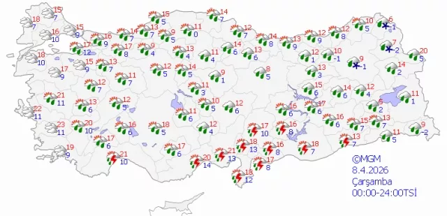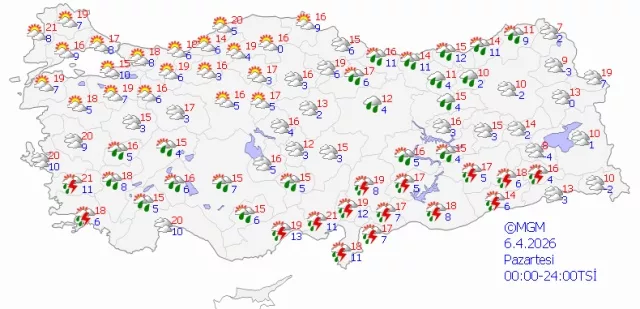 Meteoroloji Genel Müdürlüğü’nün son değerlendirmelerine göre Türkiye genelinde çok bulutlu bir hava hakim olacak. Ege, Akdeniz, İç Anadolu ve Karadeniz’in büyük bölümü ile Doğu ve Güneydoğu Anadolu bölgelerinde yağış bekleniyor. Ayrıca Balıkesir’in doğusu ile Sakarya, Bursa ve Bilecik çevrelerinde de sağanak görülecek.