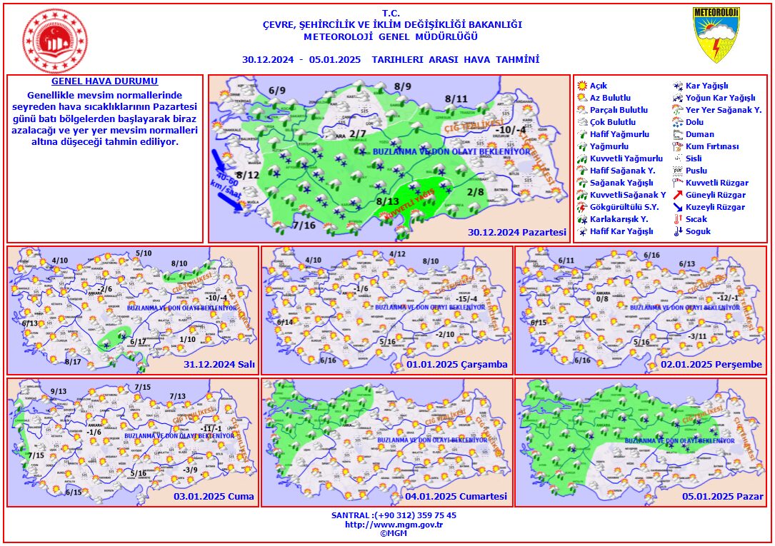 - 30 Aralık Pazartesi: Hafif Yağmurlu, en düşük 6°C, en yüksek 10°C