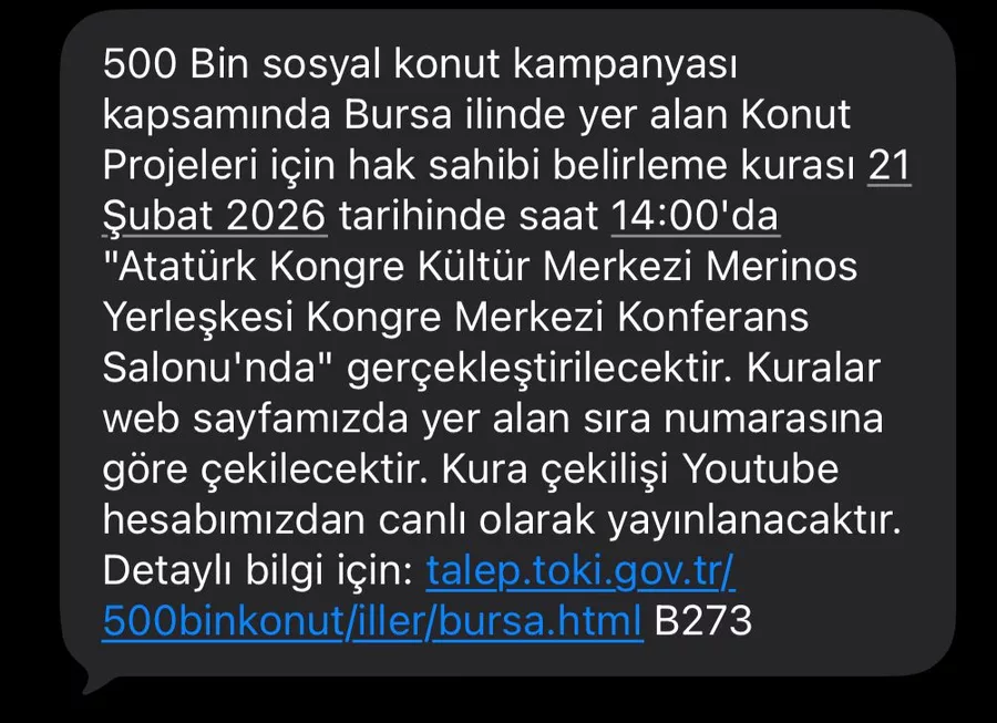 Bursa’da 500 bin sosyal konut kampanyası kapsamında yapılacak hak sahibi belirleme kuraları öncesinde vatandaşlara bilgilendirme mesajı gönderildi. TOKİ tarafından iletilen mesajda, kuraların web sayfasında yer alan sıra numarasına göre çekileceği belirtilirken, çekilişin TOKİ’nin Youtube hesabı üzerinden canlı olarak yayınlanacağı da duyuruldu. Böylece başvuru yapan vatandaşlar kura sürecini anlık olarak takip edebilecek.