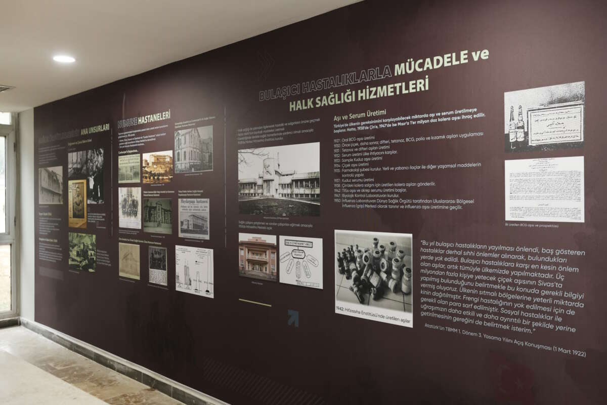 Türkiye’deki sağlık politika temellerinin nasıl atıldığı ve toplum sağlığına yönelik çalışmaların nasıl geliştirildiğinin de ele alındığı sergi, Cumhuriyet’in ilk döneminde sağlık alanında yürütülen örgütlenme çalışmalarına, toplum sağlığını geliştirmeye yönelik uygulamalara, 14 Mart Tıp Bayramı’nın tarihsel anlamına ve Türkiye’de görev yapan ilk kadın sağlık çalışanlarına yer veriyor.