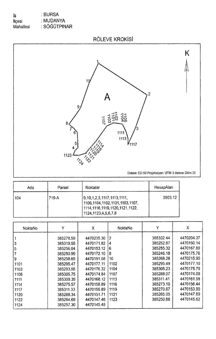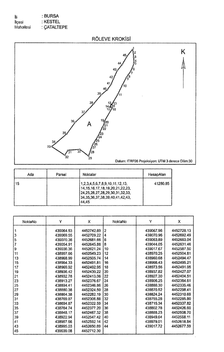 Belge eklerinde yer alan kroki ve çizelgelerde Bursa’nın Kestel ilçesi Çataltepe Mahallesi ile Mudanya ilçesi Söğütpınar Mahallesi’ndeki taşınmazların karar kapsamında olduğu görüldü. Bu alanlara ilişkin sınırlar ve yüzölçümleri teknik krokilerle detaylı şekilde gösterildi.
