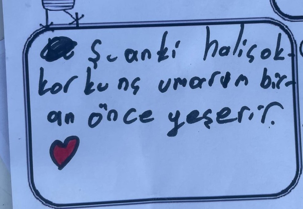 “Psikolog ve çocuk gelişim uzmanlarımızla geldik. Çocukların bazı talepleri oldu. Su oyunu ve futbol turnuvası istediler. Annelerle görüştük; çocuklarının yangından çok etkilendiğini söyledi. Çocuklarla sohbet ediyoruz. Etkinlikler düzenliyoruz süreci daha kolay atlatmaları için destek oluyoruz. Getirdiğimiz boyamalarda ormanlarla ilgili düşüncelerini yazdılar. ‘Şimdi çok gri umarım yakın zamanda yeşil olur’ diye yazanlar var. Çocuklar gri rengi sevmedi.”