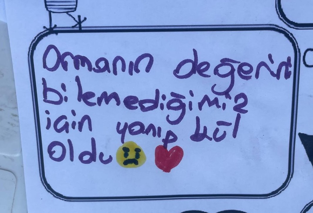 Bazı çocuklar ise boyama kağıtları üzerine, “Şu anki hali çok korkunç. Umarım bir an önce yeşerir.”, “Ormanın değerini bilemediğimiz için yanıp gül oldu”, “Hemen ağaçlandırılmalı, yeşillendirilmeli” gibi yazılarla duygularını dile getirdi.