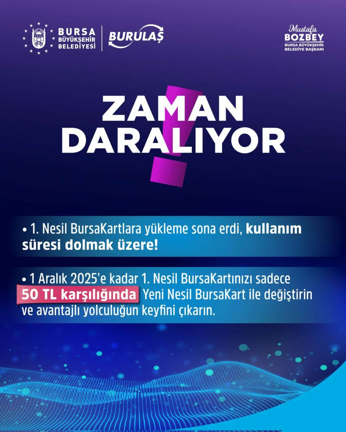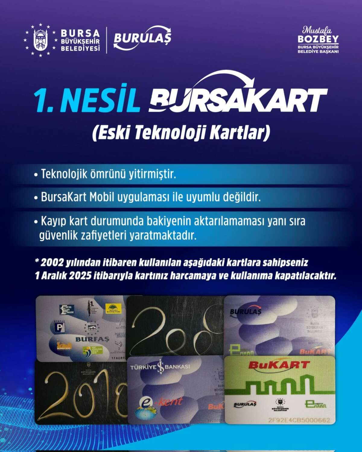 Bursa Büyükşehir Belediyesi’nin ulaşım iştiraki BURULAŞ, yaptığı açıklamada eski nesil kartların teknolojik ömrünü tamamladığını ve belirtilen tarihten sonra toplu taşıma araçlarında kullanılamayacağını duyurdu.