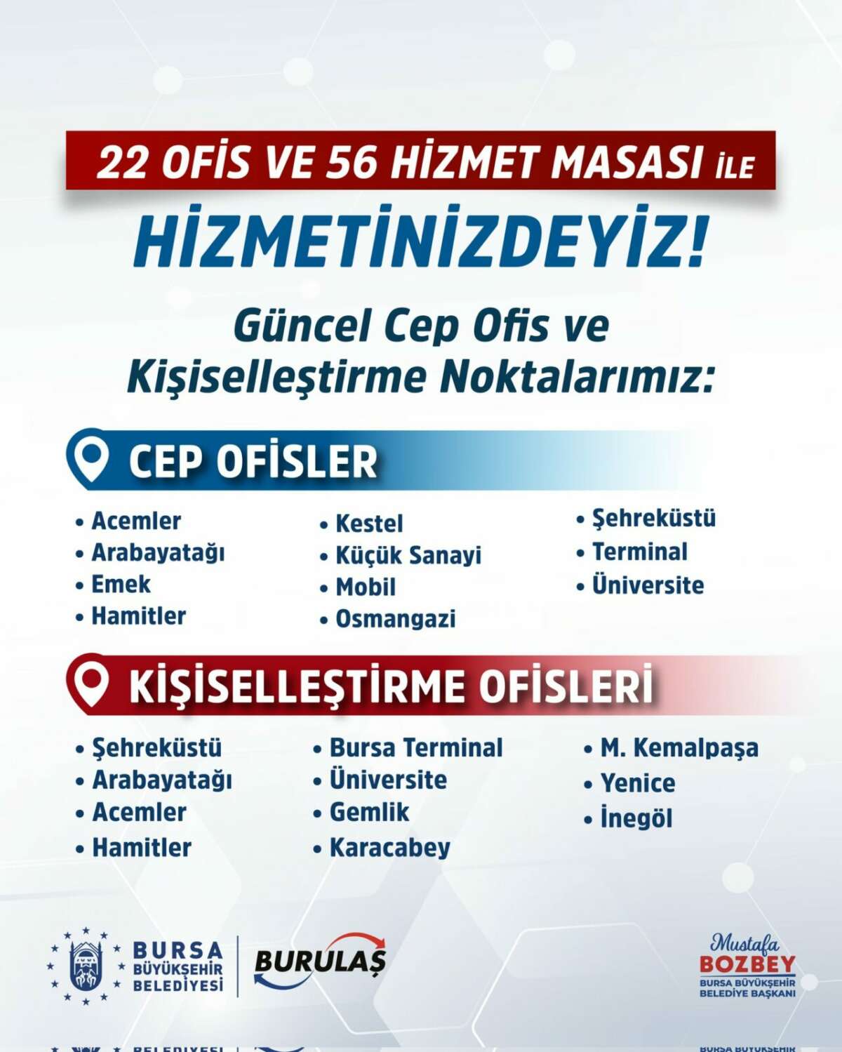 Kart değişimi, Osmangazi, Acemler, Üniversite, Arabayatağı, Hamitler, Terminal, Küçük Sanayi, Emek, Şehreküstü ve Kestel istasyonlarında veya mobil araçlar aracılığıyla gerçekleştirilebilecek. Ayrıca kent genelindeki 22 ofis ve 56 hizmet noktası da vatandaşlara hizmet verecek.