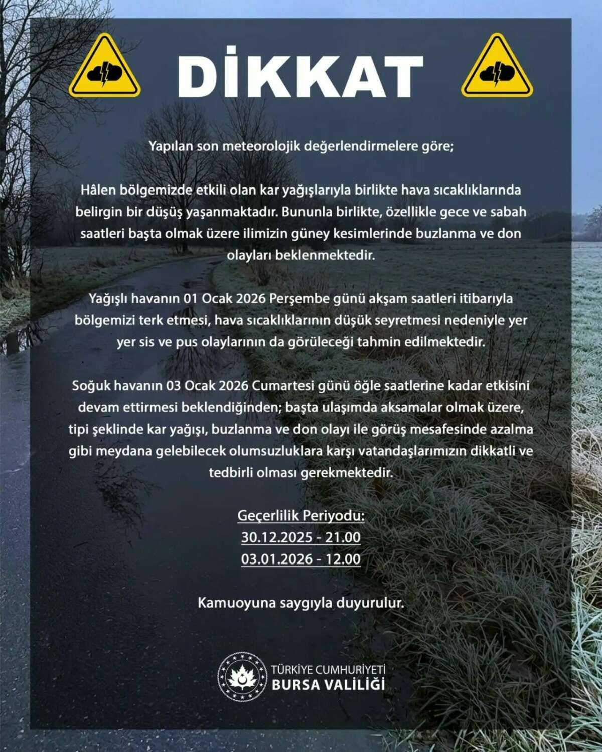 Valiliğin sosyal medya hesabından yapılan açıklamada, devam eden kar yağışıyla birlikte hava sıcaklıklarında hissedilir derecede düşüş yaşandığı belirtilerek, özellikle gece ve sabah saatlerinde, başta Bursa’nın güney kesimleri olmak üzere buzlanma ve don olaylarının beklendiği ifade edildi.