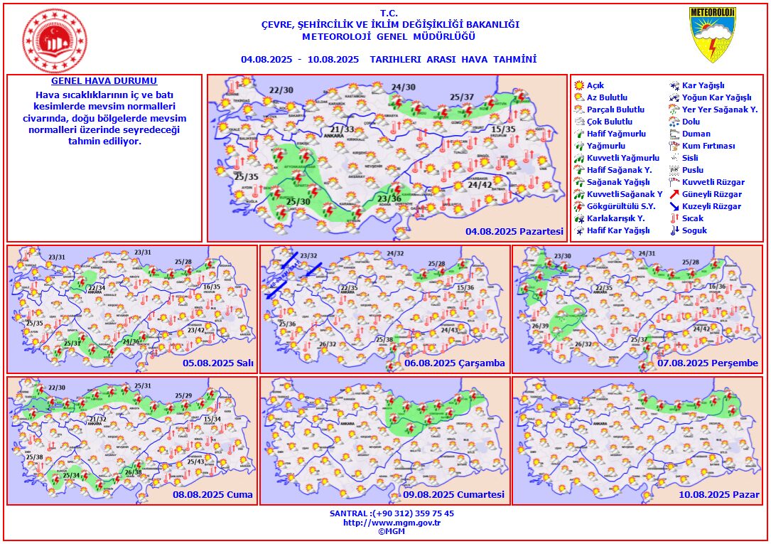 Haftanın ilk günü parçalı bulutlu, salı günü ise az bulutlu bir hava hakim olacak. Çarşamba ve cuma günleri yüksek sıcaklık uyarısı yapılırken, perşembe günü yeniden parçalı bulutlu bir hava bekleniyor.