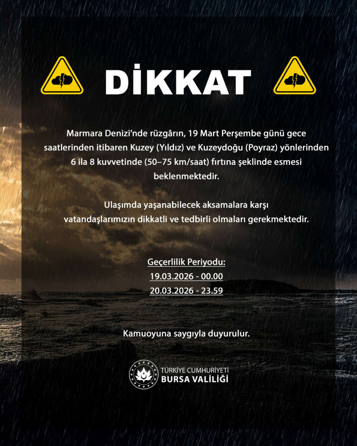 Valilikten yapılan açıklamada, 19 Mart Perşembe günü gece saatlerinden itibaren rüzgarın kuzey (yıldız) ve kuzeydoğu (poyraz) yönlerinden 6 ila 8 kuvvetinde (50-75 km/saat) fırtına şeklinde esmesinin beklendiği bildirildi. Olumsuz hava koşullarının özellikle deniz ulaşımında aksamalara yol açabileceği vurgulandı.