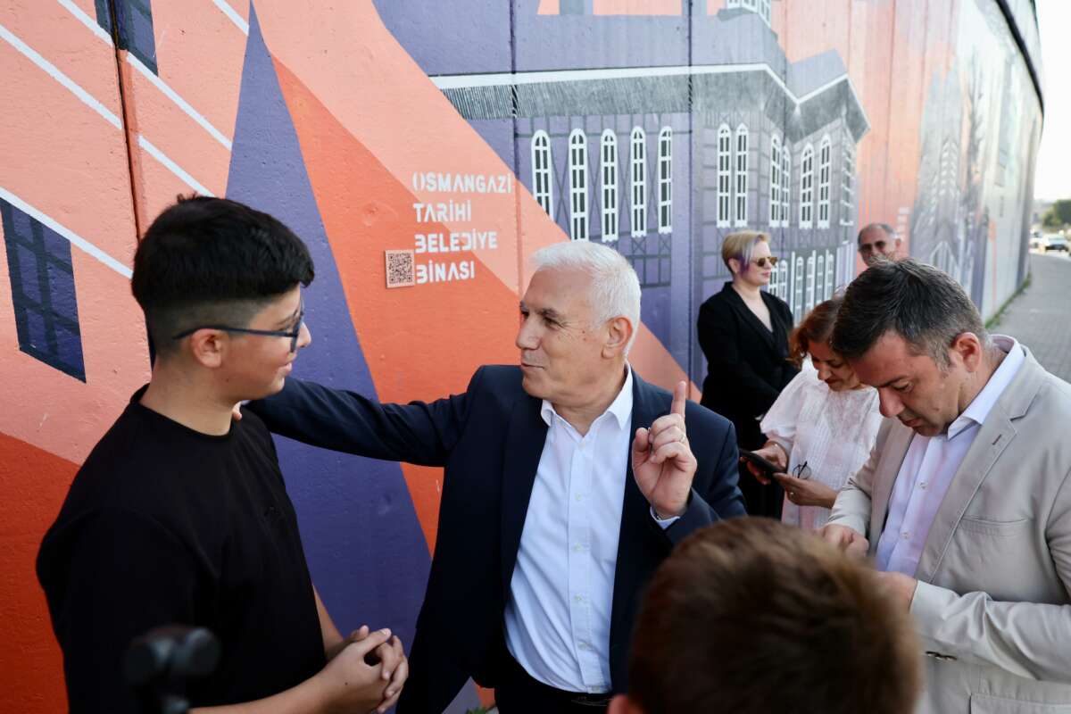 Kültürpark’ın kuzey duvarında çok anlamlı bir çalışmaya imza atıldığını söyleyen Başkan Mustafa Bozbey, Bursa’ya ait değerlerin 1000 metrekarelik alana sahip olan duvara işlendiğini belirtti. Tarihi Belediye Binası’ndan Irgandı Köprüsü’ne kadar birçok eserin resmedildiğini ifade eden Başkan Bozbey, “Bursa’nın değerlerini, kente gelen misafirlerimize tanıtma noktasında kentin farklı noktalarında duvar sanatı projeleri başlattık. Yapılan eserlerin altında QR kodları da yer alıyor. İsteyen herkes bu kodu telefonunda okutarak resmedilen tarihi eserin bilgilerini Türkçe ve İngilizce öğrenebiliyor. Bu çalışmayla Bursa’nın tanıtımına önemli bir katkı sağlamış oluyoruz. Emeği geçenlere teşekkür ediyorum” dedi.