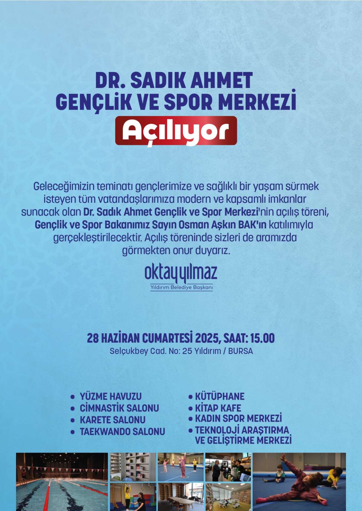 “Gençlik ve Spor Bakanımız Sayın Dr. Osman Aşkın Bak’ın teşrifleriyle, Dr. Sadık Ahmet Gençlik ve Spor Merkezimizin açılışını gerçekleştiriyoruz. Burası sadece bir bina değil; sporun, eğitimin ve kardeşliğin yeni buluşma noktası. Gençlerimizin enerjisine enerji katacak bu eşsiz merkezin açılışına tüm hemşehrilerimizi bekliyorum.”