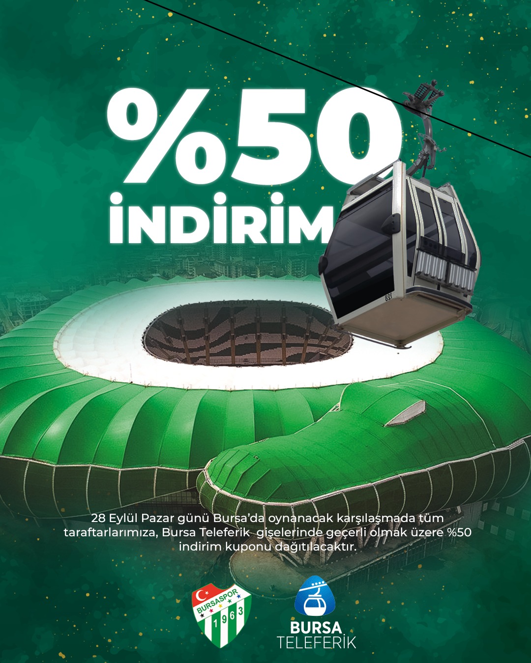 “28 Eylül’de Bursa’da oynanacak karşılaşmada taraftarlarımız için özel sürprizlerimiz var! Bursa Teleferik gişelerinde geçerli %50 indirim kuponları, Timsah Arena Stadyumu’nda sizlerle buluşuyor.”