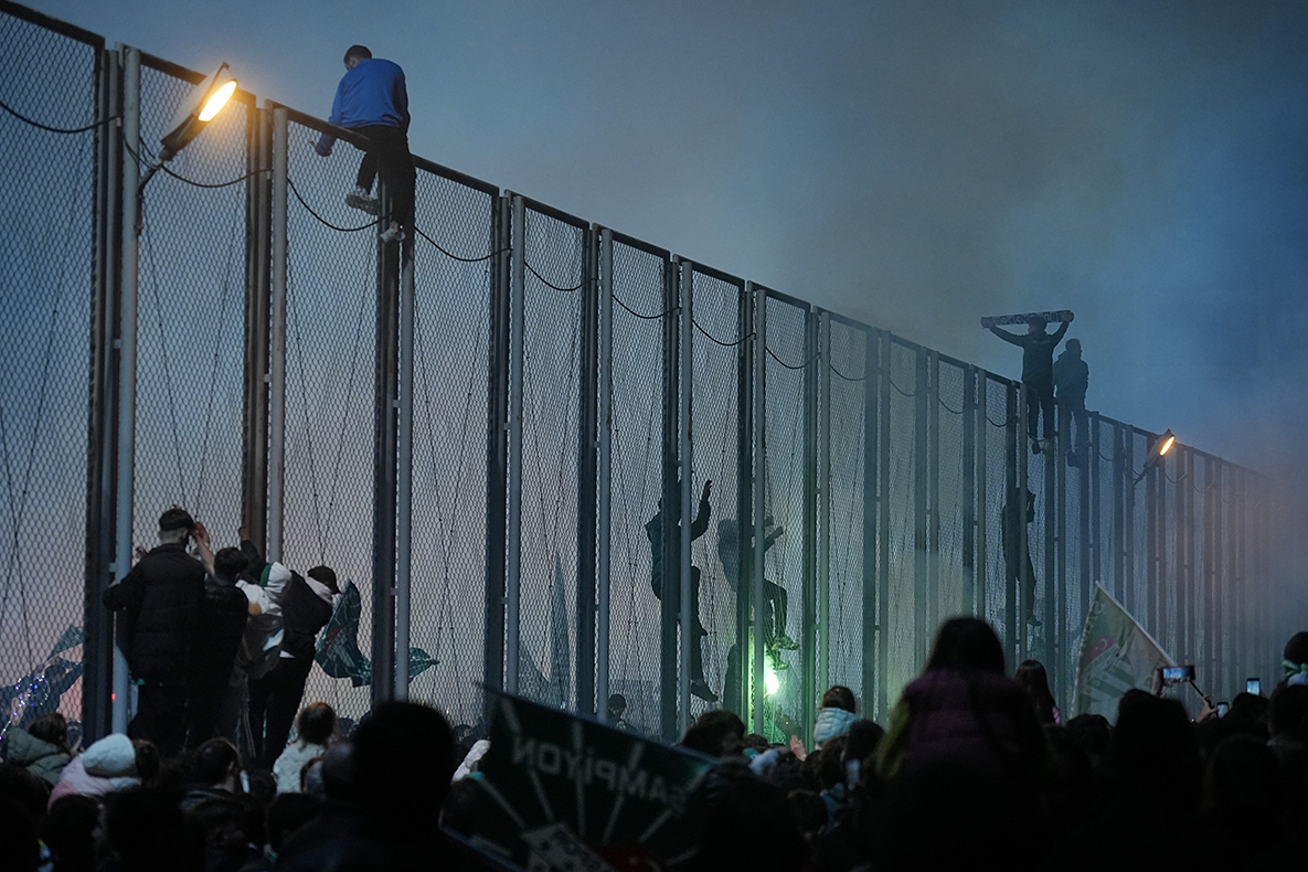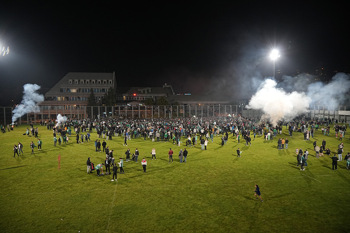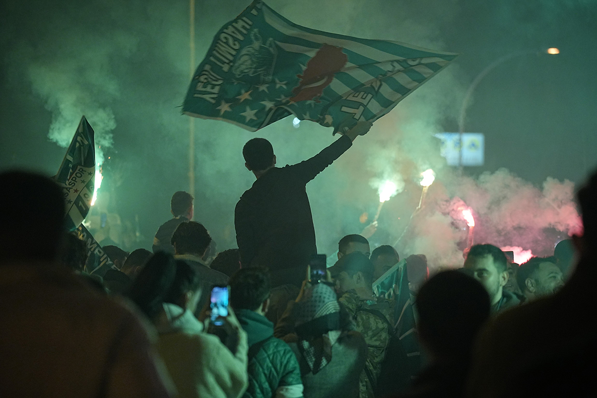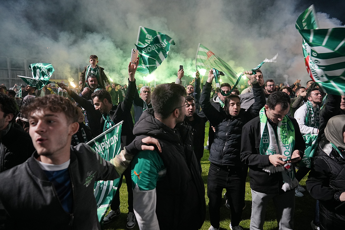 Deplasmanda Artin Hopaspor’u 2-1 mağlup edip lig bitimine 2 hafta kala şampiyonluğunu ilan eden Bursaspor maçın ardından Özlüce İbrahim Yazıcı Tesisleri’ne geldi. Yeşil-beyazlı taraftarlar takımı tesis etrafında meşaleler ve tezahüratlarla karşıladı. Yoğun ilgiyle karşılaşan takımın otobüsü kalabalıktan ilerleyemedi. Tesise çıkan kulüp yöneticileri, teknik heyet ve futbolcular, taraftarı el sallayarak selamladı. Besteler eşliğinde şampiyonluğu kutlayan takım ve taraftarlar eski teknik direktör Pablo Martin Batalla’ya da selam gönderdi.