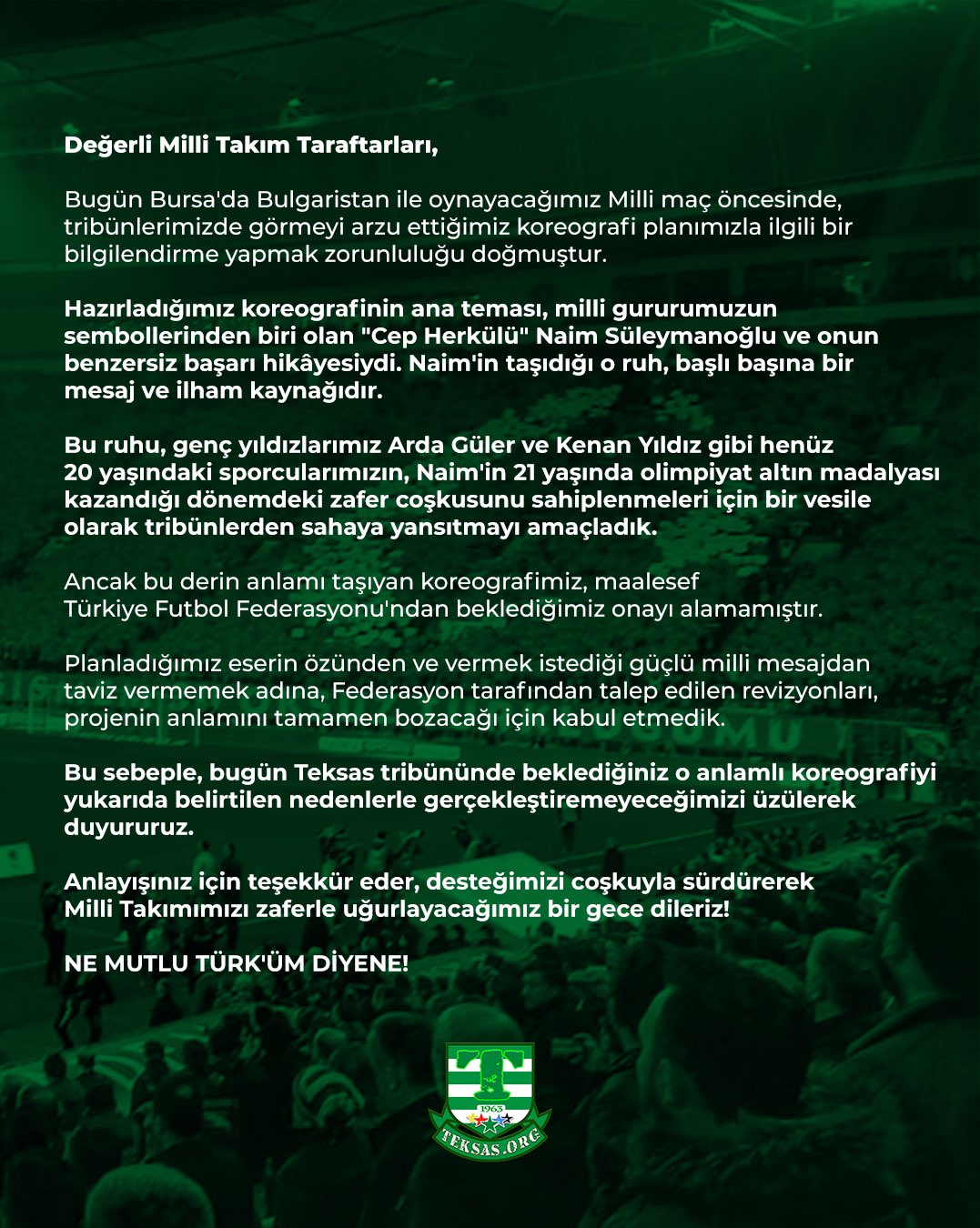 Ay yıldızlı ekibin Bursa’daki milli maçında açılması planlanan koreografinin, genç sporculara ilham veren Naim Süleymanoğlu’nun başarı hikâyesini yansıtmayı amaçladığı ifade edildi.