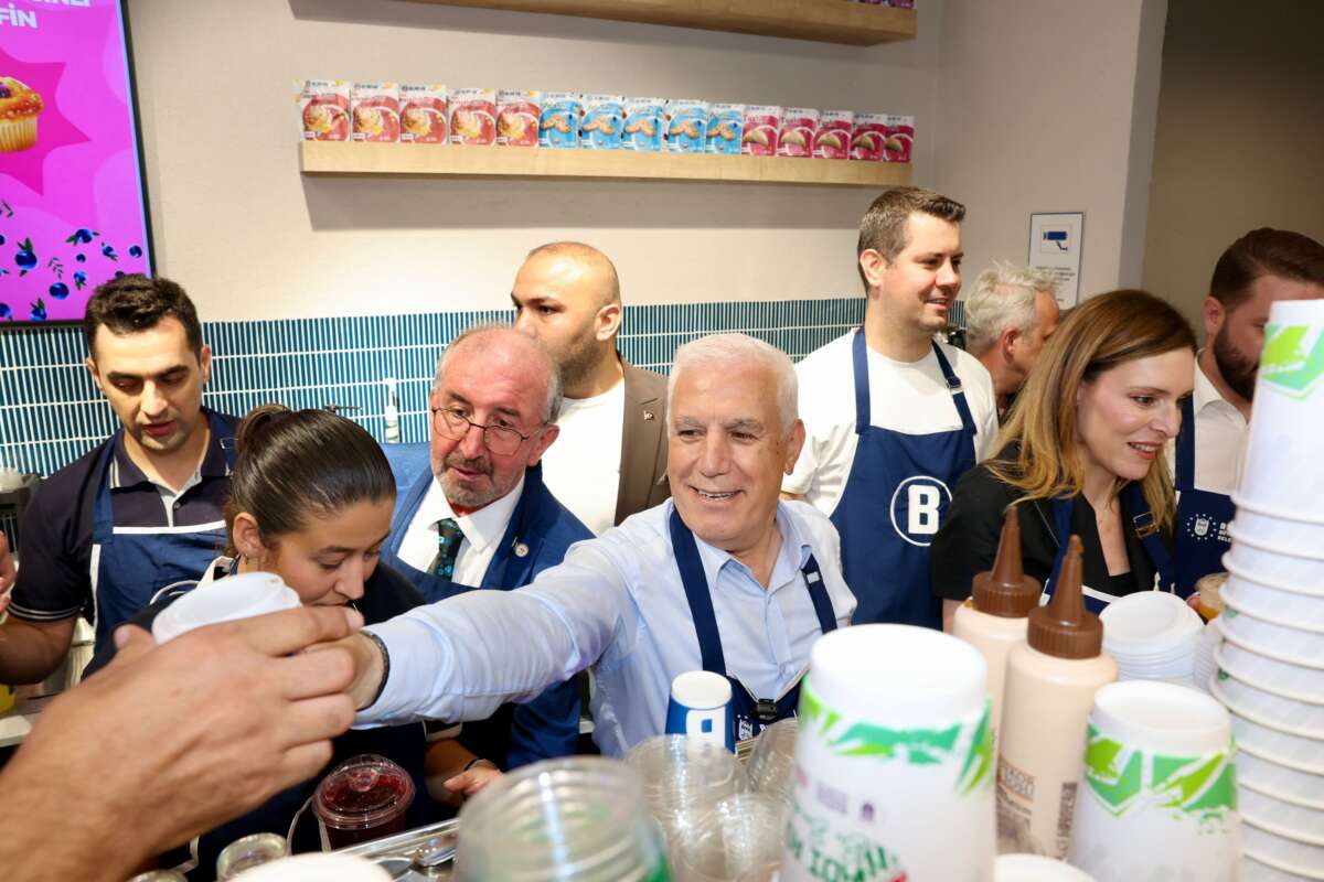 Açılış kurdelesinin kesilmesinin ardından Başkan Mustafa Bozbey ve eşi Seden Bozbey, protokol üyeleri ile birlikte barista önlüklerini giyerek vatandaşlara kahve ikramında bulundu.