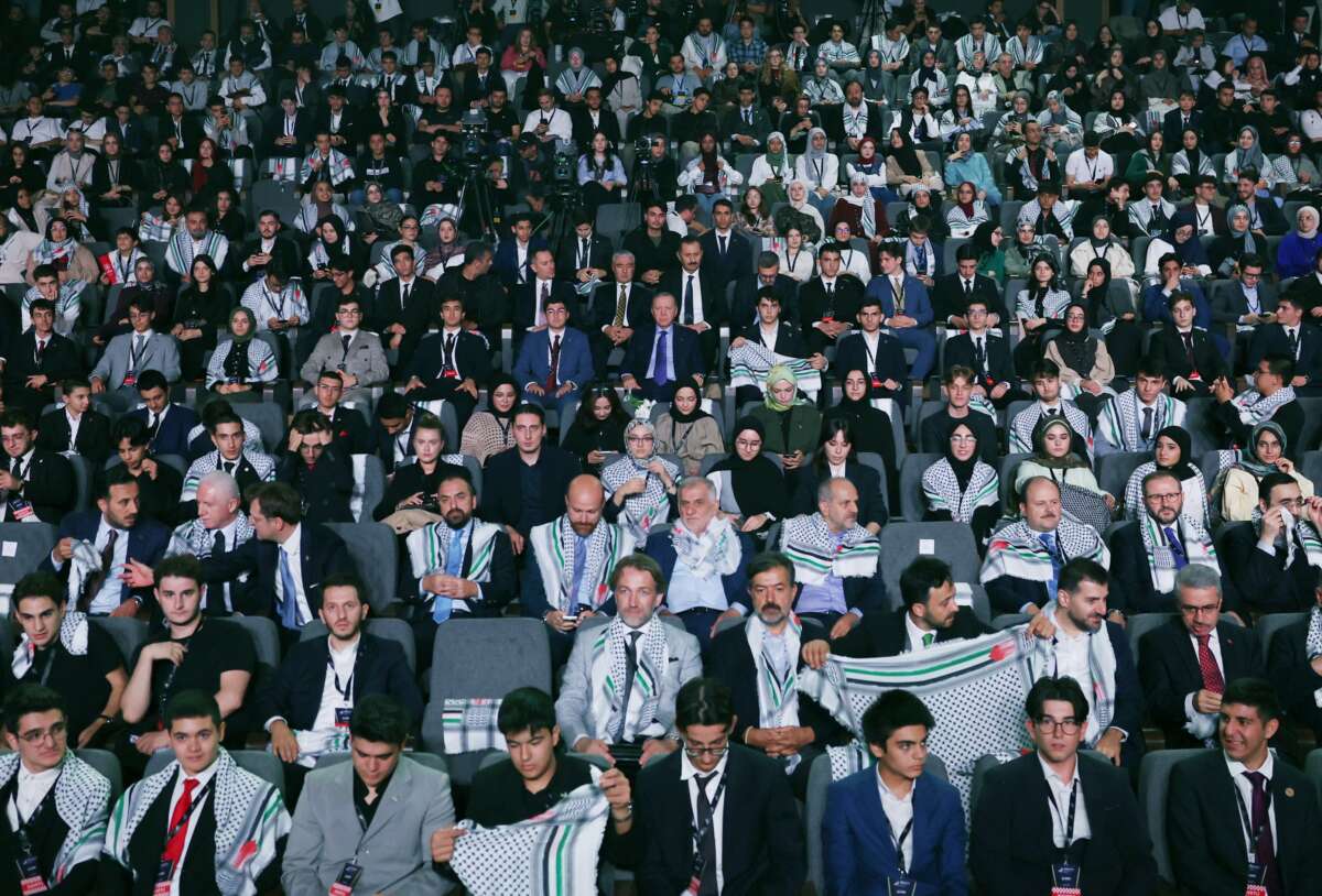 Erdoğan, “Sevgili gençler, çok değerli misafirler, küresel sistem iflas etti derken bunu hamaset olsun diye söylemiyoruz. Tam tersine, ülke olarak biz iflas etmiş bu sistemin tüm yükünü çeken bir bölgede yer alıyoruz. Şu an insanlığın gündemini domine eden kriz, gerilim, soykırım, çatışma ve zulümlerin neredeyse tamamı bu coğrafyada yaşanıyor. Her ne kadar Türkiye, bölgesinde bir istikrar ağabeyliği olarak yükselse de, hadiselerin uzağında bir ülke değildir. Bir defa şunu hepimiz çok iyi biliyoruz, komşumuzun evi yanarken nasıl biz rahat edemezsek, bölgemizde sıkıntı varken de biz huzurlu olamayız. Dahası kriz ve zulümlerle boğuşanlar bizim kardeşlerimiz, bizim yüz yıllık, bin yıllık komşularımız. İnsan komşusuna sırtını dönebilir mi?. Bu ülke ve bu aziz millet tarihin hiçbir döneminde bana ne dememiştir. Gönül coğrafyasına sırtını dönmemiştir. Dünyanın neresinden gelirse gelsin yardım çağrılarına kulaklarını tıkamamıştır. Uzak yakın demeden, Müslüm, gayrimüslim demeden, kimsenin inancına, mezhebine, kökenine bakmadan imdat diyenin yardımına koşmuştur. Bu dün böyleydi, bugün de böyle. Herkes kayıtsız kalsa dahi biz coğrafyamızdaki acılara, zulümlere, sonu gelmeyen çatışmalara duyarsız kalamayız” ifadelerini kullandı.