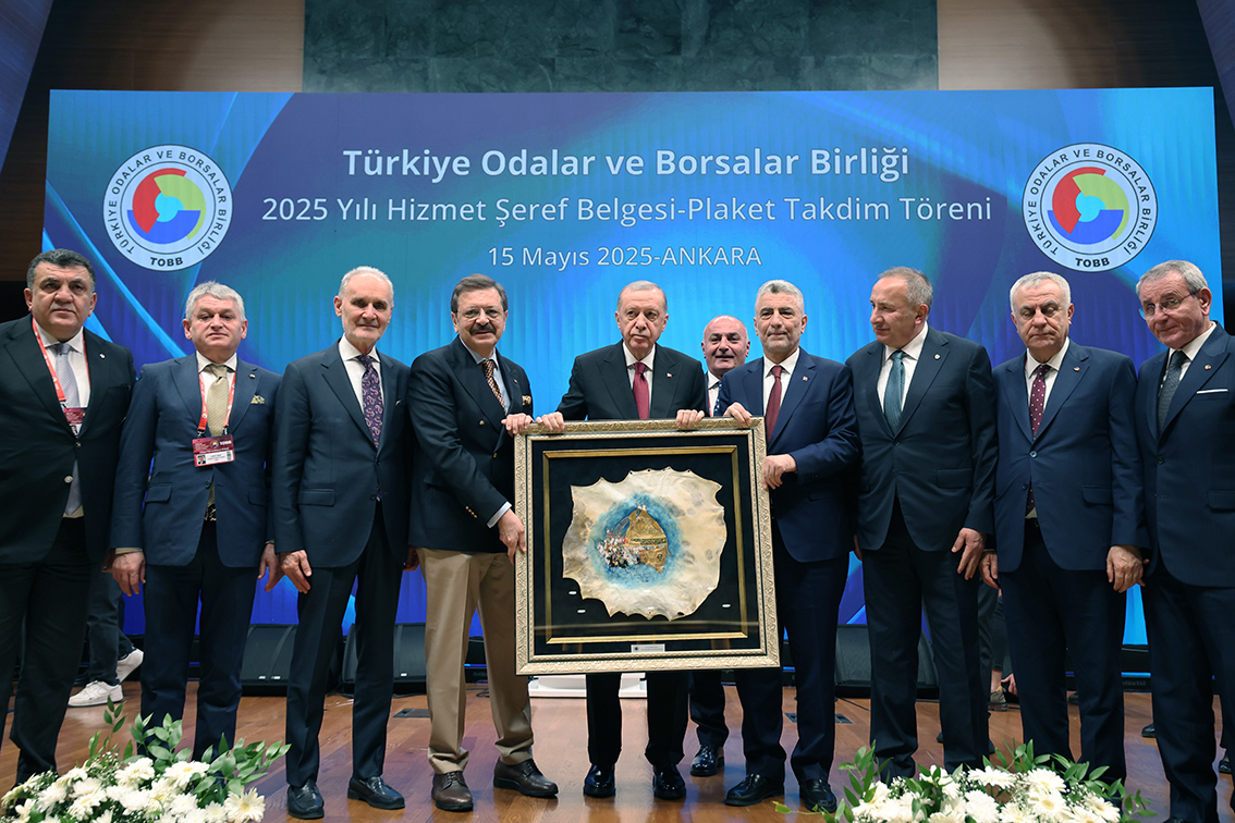 Cumhurbaşkanı Recep Tayyip Erdoğan, Türkiye Odalar ve Borsalar Birliği (TOBB) tarafından düzenlenen 2025 Yılı Hizmet Şeref Belgesi ve Plaket Takdim Töreni’ne katıldı. Törende konuşan Cumhurbaşkanı Erdoğan, program vesilesiyle iş dünyası temsilcileriyle bir araya gelmekten memnuniyet duyduğunu ifade etti. TOBB’un önemli bir geleneği haline gelen bu anlamlı töreninin her yıl mayıs ayında gerçekleştirildiğini belirten Erdoğan, “Bugün bir kez daha bu güzel atmosferde gönüllerimizi buluşturan Sayın Başkana ve birlik yönetimine teşekkür ediyorum” dedi.