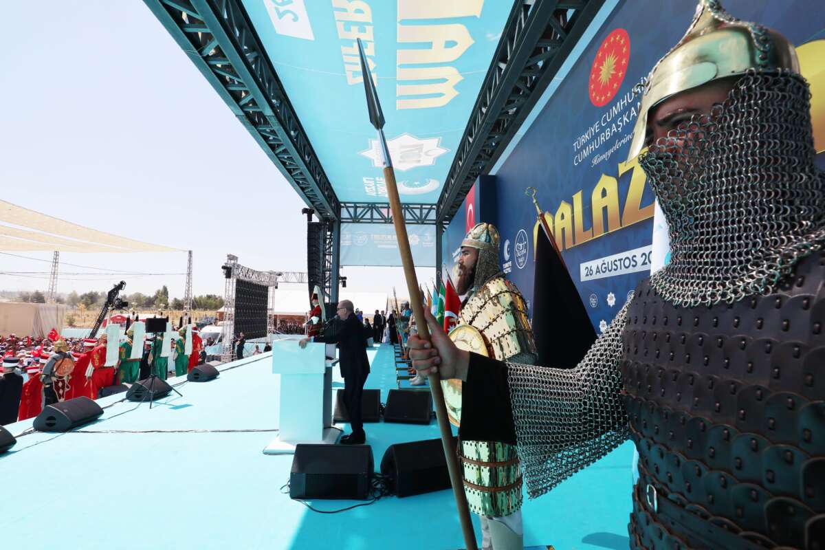 Malazgirt Zaferi’nin 954. yıl dönümü kutlamalarına katılmak üzere dün geldiği Bitlis’in Ahlat ilçesinde geceyi geçiren Cumhurbaşkanı Erdoğan, beraberindeki MHP Lideri Devlet Bahçeli ve bakanlarla öğle saatlerine doğru Muş’un Malazgirt ilçesine geldi. Burada toplanan kalabalığa hitap eden Erdoğan, “Sevgili Muşlu kardeşlerim, ülkemin dört bir yanından şu anda Malazgirt’te bir araya gelen kardeşlerim, Milliyetçi Hareket Partisi’nin Genel Başkanı Sayın Devlet Bahçeli, siyasi partilerimizin saygıdeğer genel başkanları, yarınlarımızın teminatı sevgili gençler, kıymetli hanımefendiler, değerli misafirler, sizleri en kalbi duygularımla, hürmetle, muhabbetle selamlıyorum. Sizlerin şahsında Hakkari’den Edirne’ye, Muğla’dan Kars’a, Hatay’dan Sinop’a 81 ilimizdeki 86 milyon vatandaşımızın tamamına selamlarımı sevgilerimi gönderiyorum. Yine buradan İsrail’in barbar saldırıları altında hayat ve haysiyet mücadelesi veren Gazzeli, Filistinli kardeşlerimizi selamlıyor. Kendilerine dayanışma mesajlarımızı iletiyorum. Dün Ahlat’ta gençlerimizle hasret giderdik. Kubbetül İslam’ın o ferah ve vakur iklimini doya doya teneffüs ettik. Ardından kabine toplantımızı Cumhurbaşkanlığı Ahlat Külliyemizde gerçekleştirdik. Akabinde milletimize yine Ahlat’tan seslendik. Bugün de sizlerle birlikte o müstesna zaferin 954. yıl döneminde Malazgirt’teyiz. Bu meydanı hıncahınç doldurarak heyecanımıza ortak olan siz kıymetli kardeşlerime ayrı ayrı teşekkür ediyorum” dedi.