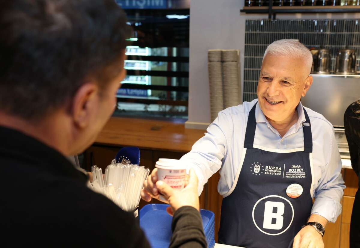 Eşi Seden Bozbey ile birlikte barista önlüklerini giyen Başkan Bozbey, Cumhuriyetin 102. yılına özel olarak hazırlanan ‘Cumhuriyet Demek’ temalı bardaklarda içecek ikramında bulundu. Vatandaşların isimlerini ‘Cumhuriyet demek’ temalı bardaklara yazan Başkan Mustafa Bozbey ve eşi Seden Bozbey, Atatürk’ün emanet ettiği Cumhuriyet’in sıcaklığını Bursalılarla birlikte paylaştı. Bu sene kutlamaların teması olan ‘Cumhuriyet demek, hepimiz demek’ sloganını da yazarak ikramda bulunan Başkan Bozbey ve eşi Seden Bozbey, kahve keyfini vatandaşlarla birlikte yaşadı.