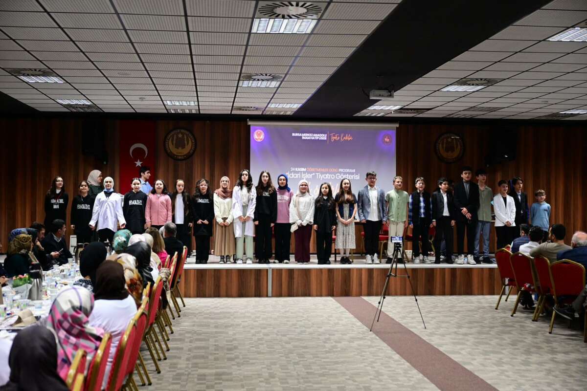 Kutlamalar kapsamında Okul Tiyatro Topluluğu öğrencileri tarafından hazırlanan 24 Kasım programı sahnelendi. Öğrencilerin performansı izleyicilerden tam not aldı. Programın sonunda Davut Gürkan, temsilen okulun en genç öğretmenine çiçek takdim etti.