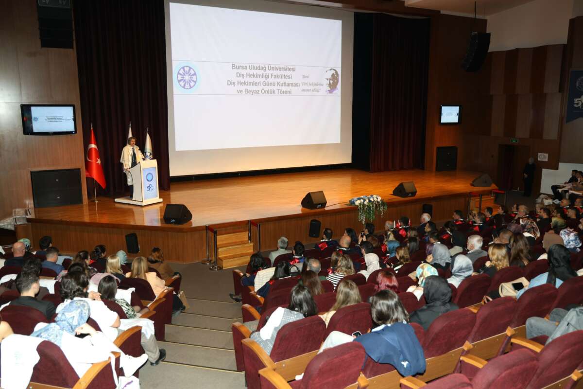 Diş Hekimleri Günü Kutlaması ve fakülteye yeni başlayan öğrencilerin mesleğe ilk adımlarını simgeleyen beyaz önlük giyme törenine BUÜ Rektörü Prof. Dr. Ferudun Yılmaz, Rektör Yardımcısı Prof. Dr. İrfan Kırıştıoğlu, Fakülte Dekanları, BUÜ Hastanesi Başhekimi Prof. Dr. Halil Sağlam, akademisyenler, iş insanları, veliler ve öğrenciler katıldı.