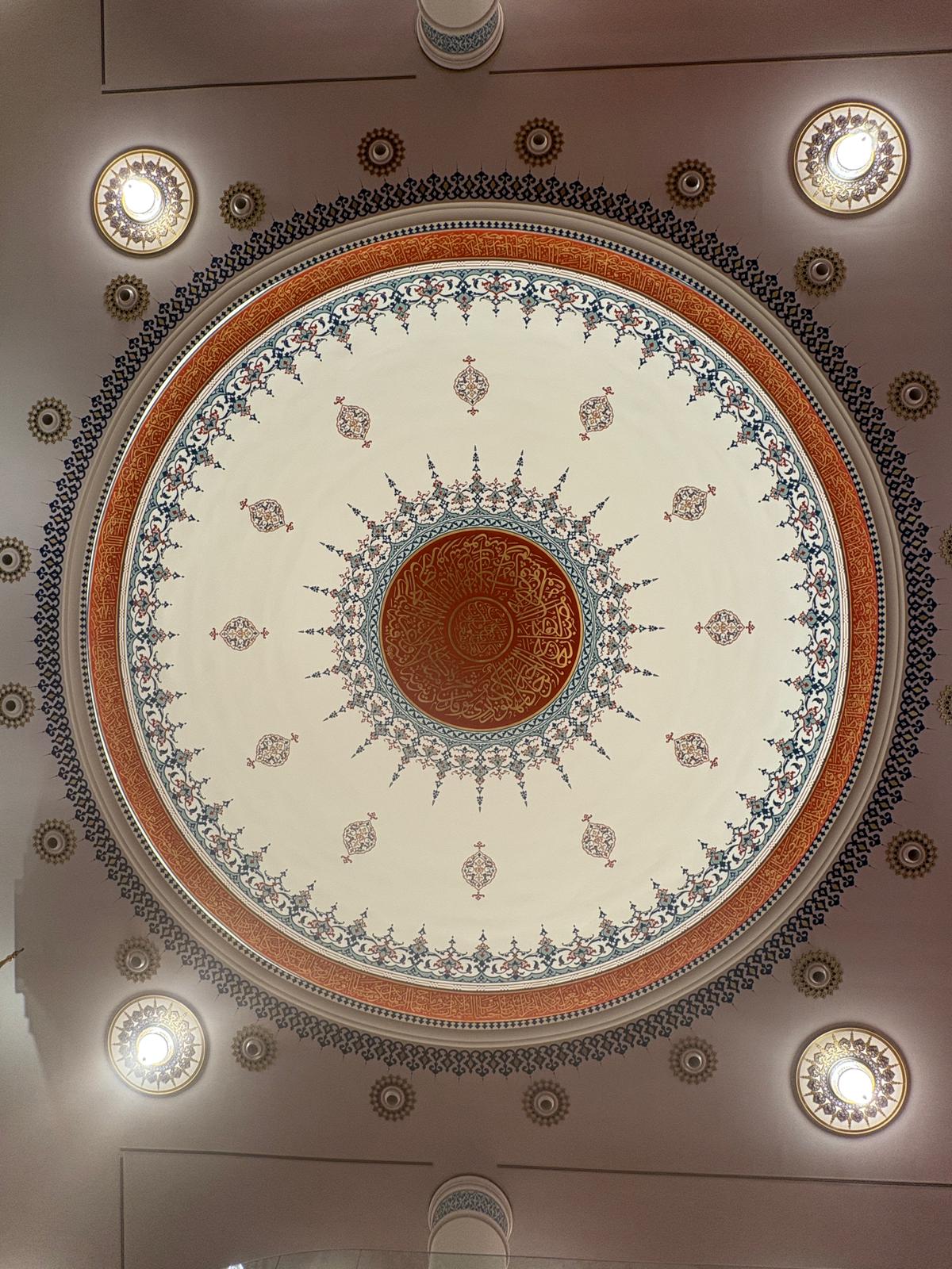 Levent Eski, caminin iç bölümlerini anlatırken hem sanatsal hem teknik detaylara dikkat çekti. İç mekânın tamamının Limra taşıyla kaplandığını, tavan süslemelerinde çetkari ve kalem işi tekniklerinin kullanıldığını, Bursa’da bu ölçekte bir iç süsleme çalışmasının ilk kez yapıldığını söyleyerek, “3 binden fazla kişinin namaz kılabileceği bir alan oluşturduk. Yerden ısıtmalı, havalandırma ve klima sistemleri modern kontrol altyapısıyla donatıldı. Ses sistemi 40’tan fazla bölgeye ayrıldı; 102 hoparlörle insan sesinin doğal frekansını en doğru şekilde iletecek bir yapı kuruldu. Tavan süslemelerinde 6.100 adet yıldız motifi, yüzlerce çetkari ve zilbahar işçiliği kullanıldı. 60 metrekarelik bu alan camimizin ruhunu yansıtıyor. Kubbede ise Nur Suresi’nin 35’inci ayeti yer alıyor” dedi.