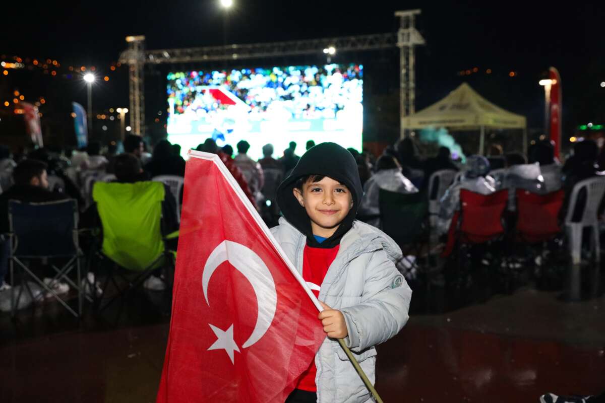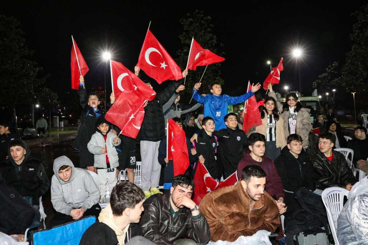 Her iki alanda da vatandaşlara Türk bayrakları dağıtılırken, Hüdavendigar Kent Parkı’nda etkili olan yağmura rağmen alanları dolduran Bursalılar, tezahüratlar eşliğinde milli takıma destek vererek unutulmaz bir atmosfer oluşturdu.