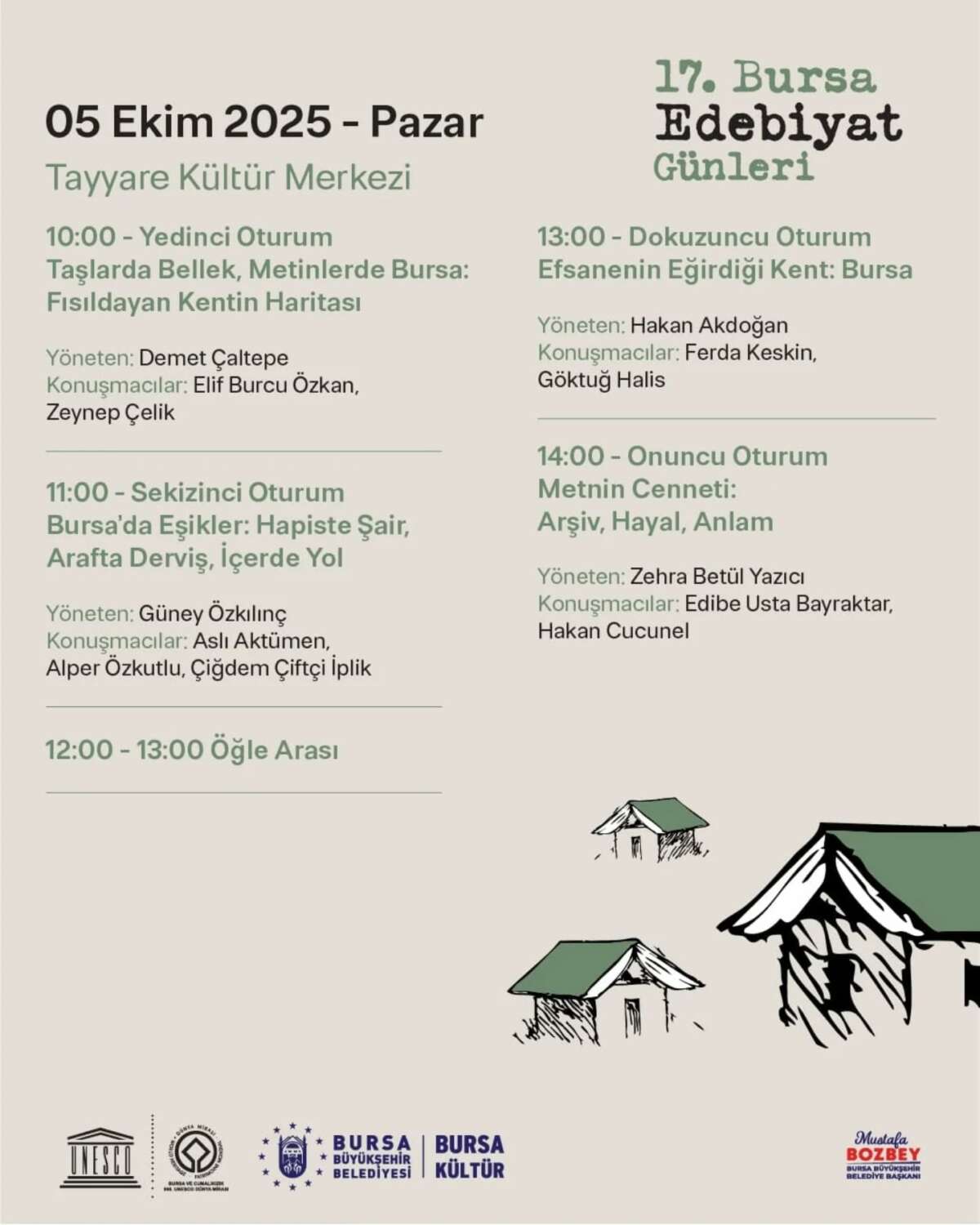 Edebiyat Günleri’nin üçüncü gününde ise ‘Taşlarda Bellek’, ‘Metinler Bursa: Fısıldayan Kentin Haritası’, ‘Bursa’da Eşikler: Hapiste Şair, Arafta Derviş, İçerde Yol’, ‘Efsanenin Eğirdiği Kent: Bursa’, ‘Metnin Cenneti: Arşiv, Hayal, Anlam’ konulu oturumlarda yazarlar fikirlerini Bursalılarla paylaşacak.