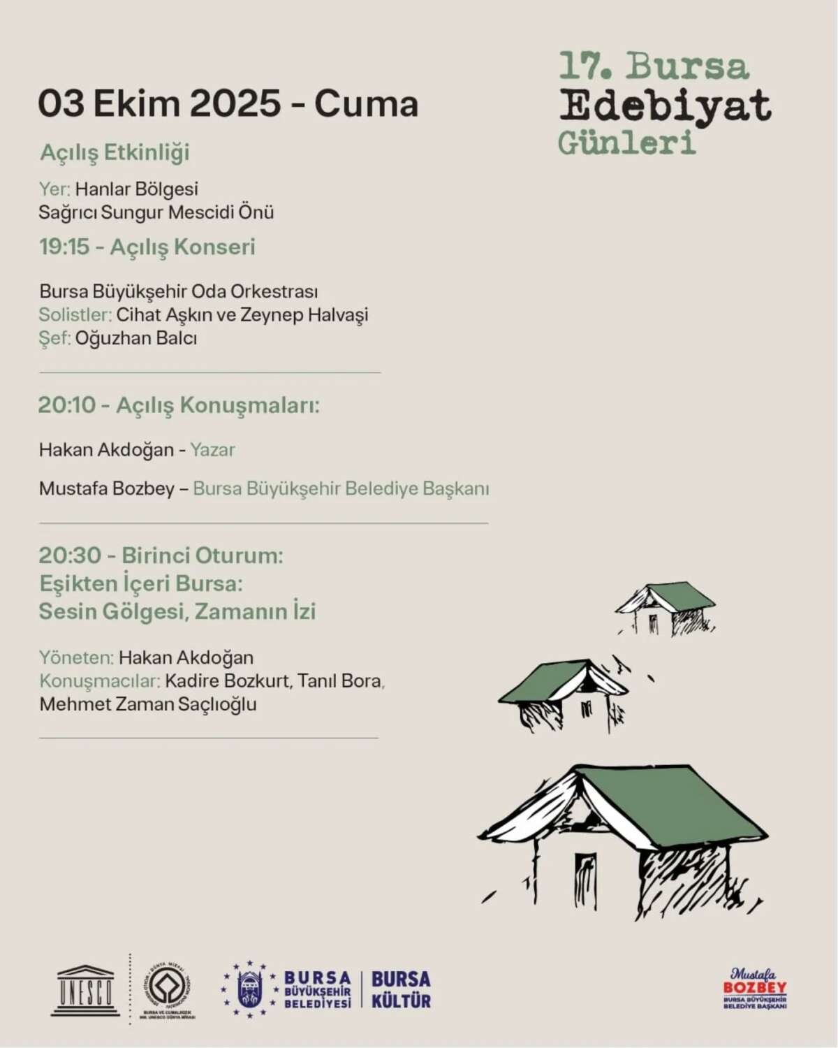 Bursa Edebiyat Günleri, 3 Ekim Cuma Günü saat 19.15’te Hanlar Bölgesi Sağrıcı Sungur Mescidi önünde Büyükşehir Oda Orkestrası’nın vereceği açılış konseri ile başlayacak. Yazar Hakan Akdoğan ve Büyükşehir Belediye Başkanı Mustafa Bozbey’in konuşacağı program, Kadire Bozkurt, Tanıl Bora, Mehmet Zaman Saçlıoğlu’nun konuşmacı olduğu ‘Eşikten İçeri Bursa: Sesin Gölgesi, Zamanın İzi’ adlı oturumla devam edecek.
