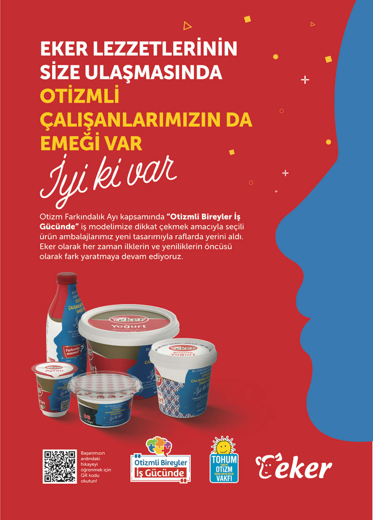 Eker Süt Ürünleri, her yıl olduğu gibi bu yıl da Otizm Farkındalık Ayı olan nisan ayında ürün ambalajlarında özel tasarımlara yer veriyor. Otizm konusunda farkındalık oluşturmayı ve otizmli bireylerin iş hayatındaki varlığına dikkat çekmeyi hedefleyen ambalajlarda; “Bu ürünün sofranıza ulaşmasında otizmli çalışanlarımızın da emeği var. İyi ki var” mesajına yer veriliyor. Mesajın hemen altında ise sosyal medyada otizm ile ilgili paylaşımlarda sıkça kullanılan ‘OtizmeKırmızıIşıkYak’ mottosu bulunuyor.