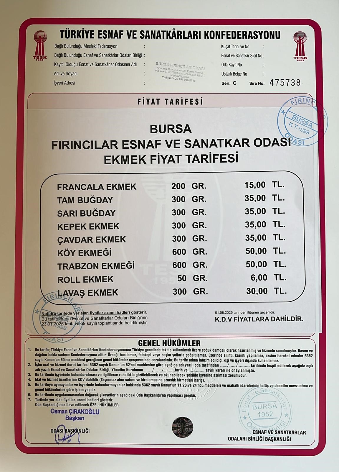 Buna göre 200 gram beyaz ekmek 15 liradan satılacak. 300 gram tam buğday, sarı buğday, kepek, çavdar ekmeği 35 lira, 600 gram köy ekmeği ve Trabzon ekmeği 50 lira, roll ekmek 6 lira, 300 gramlık lavaş ekmeği ise 30 liradan satılacak.Bursa Fırıncılar Odası artan maliyetler karşısında 2 Ocak 2025 tarihinde ekmek fiyatlarına yüzde 25 zamla birlikte daha önce 10 liradan satılan 200 gram ekmeği 240 gram olarak 15 liradan satmaya başladı. Ancak, 1 Ağustos 2025 tarihinden itibaren fiyat yine 15 lira olarak kalacağı belirtilirken, 240 gram olan ekmek 200 grama düşürüldü.