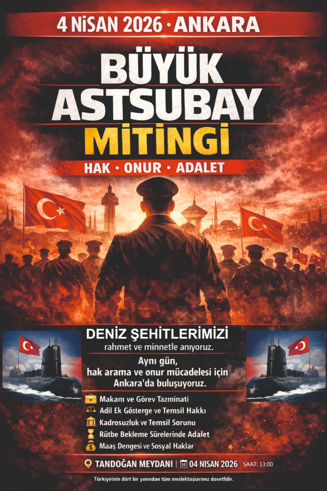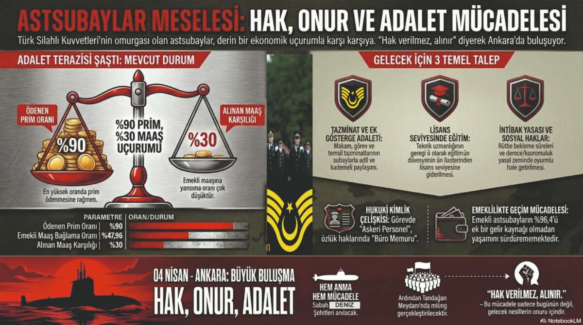 Saat 13.00’te başlayacak açık hava toplantısında 40 yılı aşkın süredir Emekli Astsubay özlük hakları, maaş dengesi ve sosyal haklarına ilişkin verilen sözlere rağmen yapılmayan, sürekli olarak ötelenen talepleri “Hak, Onur ve Adalet” temasıyla kamuoyuyla paylaşılacak. Bu anlamlı gün, hem geçmişin hüzünlü hatıralarını yad etmek hem de hak ve adalet haykırışının geleceğe dair mücadele azminin bitmeyeceğini ortaya koymak açısından tarihi bir önem