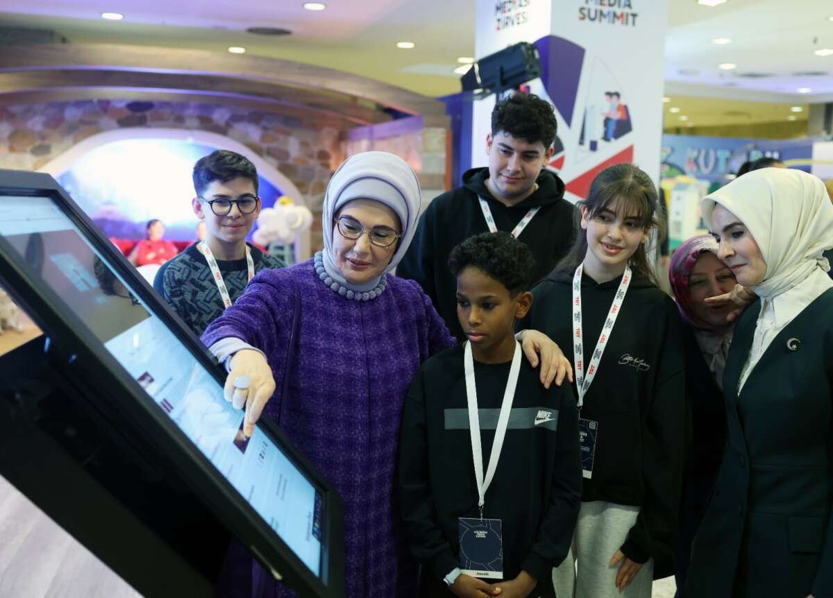 Emine Erdoğan, zirvenin çocukların medya okuryazarlığını güçlendirmeyi ve çocuk dostu içerik üretimini teşvik etmeyi amaçlayan yapısına dikkat çekmek için yapılan etkinlikleri de yerinde inceledi.