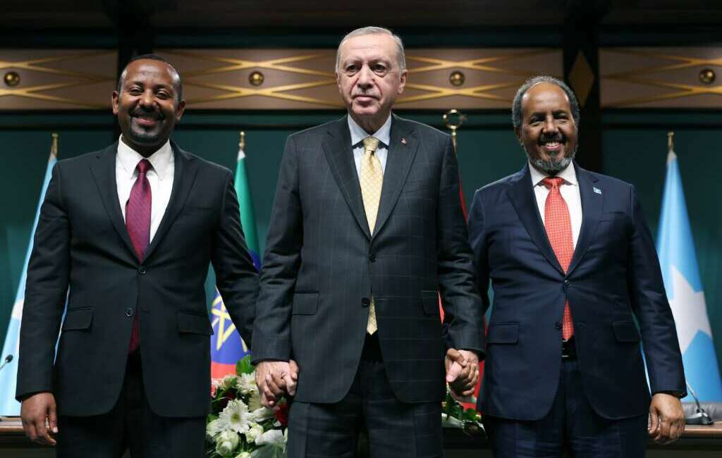 Cumhurbaşkanı Recep Tayyip Erdoğan, Somali Cumhurbaşkanı Hasan Şeyh Mahmud ve Etiyopya Başbakanı Abiy Ahmed ile Ortak Basın Toplantısı’nda konuştu. Etiyopya’nın ocak ayında Somaliland bölgesiyle bir mutabakat zaptı imzalamasının ardından ortaya çıkan kriz Cumhurbaşkanı Recep Tayyip Erdoğan’ın devreye girmesiyle çözüldü. Taraflar arasında Türkiye’nin arabuluculuk çabalarıyla 8 ay önce başlatılan süreç, Ankara’da Cumhurbaşkanı Erdoğan’ın başkanlığında gerçekleşen görüşmede barışla neticelendi.