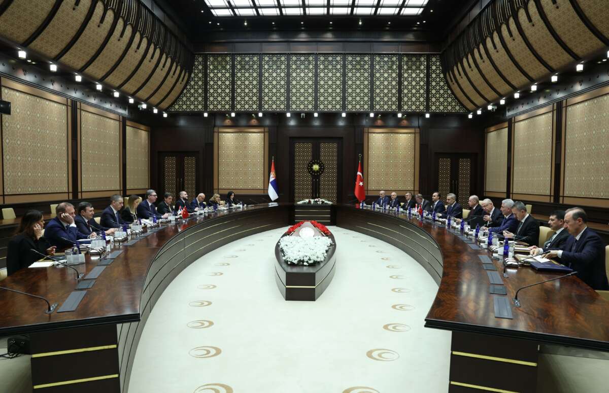 Cumhurbaşkanı Erdoğan, Sırbistan Cumhurbaşkanı Aleksandar Vucic ile Cumhurbaşkanlığı Külliyesinde bir araya geldi. Cumhurbaşkanı Erdoğan, Aleksandar Vucic’i resmi törenle karşıladı ve daha sonra ikili görüşme gerçekleştirdi. Heyetler arası gerçekleştirilen diğer görüşmenin ardından Cumhurbaşkanı Erdoğan ve Aleksandar Vucic ortak basın toplantısı düzenledi.